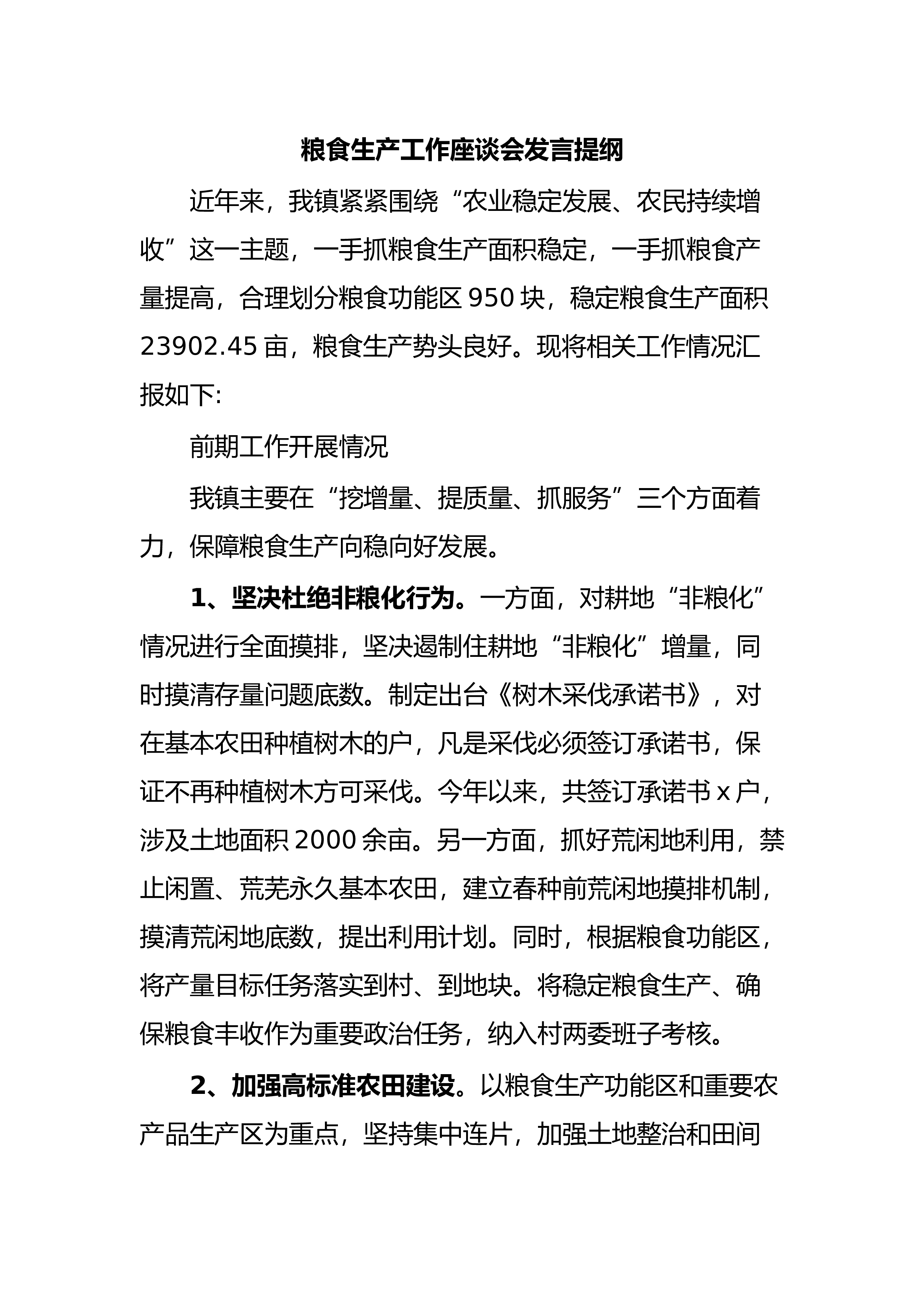 近年来,我镇紧紧围绕“农业稳定发展、农民持续增收”这一主题,一手抓粮食生产面积稳定,一手抓粮食产量提高,合理划分粮食功能区950块,稳定粮食生产面积23902.45亩,粮食生产势头良好。现将相关工作情况汇报如下:前期工作开展情况我镇主要在“挖增量、提质量、抓服务”三个方面着力,保障粮食生产向稳向好发展。1、坚决杜绝非粮化行为。一方面,对耕地“非粮化”情况进行全面摸排,坚决遏制住耕地“非粮化”增量,同时摸清存量问题底数。制定出台《树木采伐承诺书》,对在基本农田种植树木的户,凡是采伐必须签订承诺书,保证不再种植树木方可采伐。今年以来,共签订承诺书x户,涉及土地面积2000...