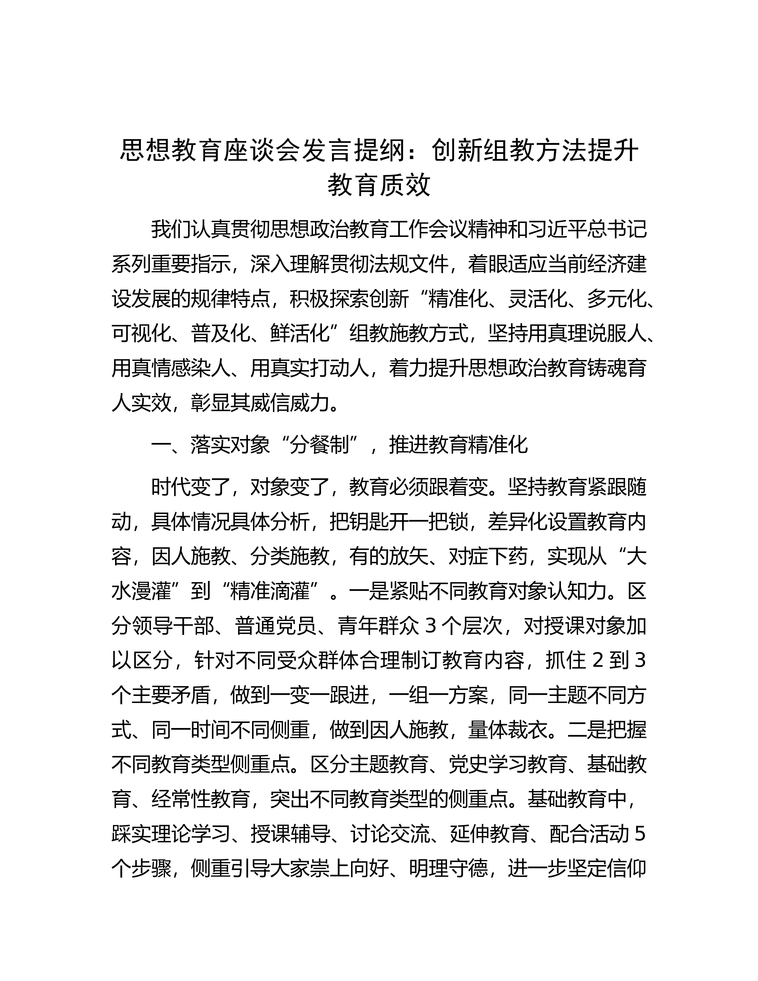 :创新组教方法提升教育质效我们认真贯彻思想政治教育工作会议精神和习近平总书记系列重要指示,深入理解贯彻法规文件,着眼适应当前经济建设发展的规律特点,积极探索创新“精准化、灵活化、多元化、可视化、普及化、鲜活化”组教施教方式,坚持用真理说服人、用真情感染人、用真实打动人,着力提升思想政治教育铸魂育人实效,彰显其威信威力。一、落实对象“分餐制”,推进教育精准化时代变了,对象变了,教育必须跟着变。坚持教育紧跟随,具体情况具体分析,把钥匙开一把锁,差异化设置教育内容,因人施教、分类施教,有的放矢、对症下药,实现从“大水漫灌”到“精准滴灌”。一是紧贴不同教育对象认知力。区分领导干部...