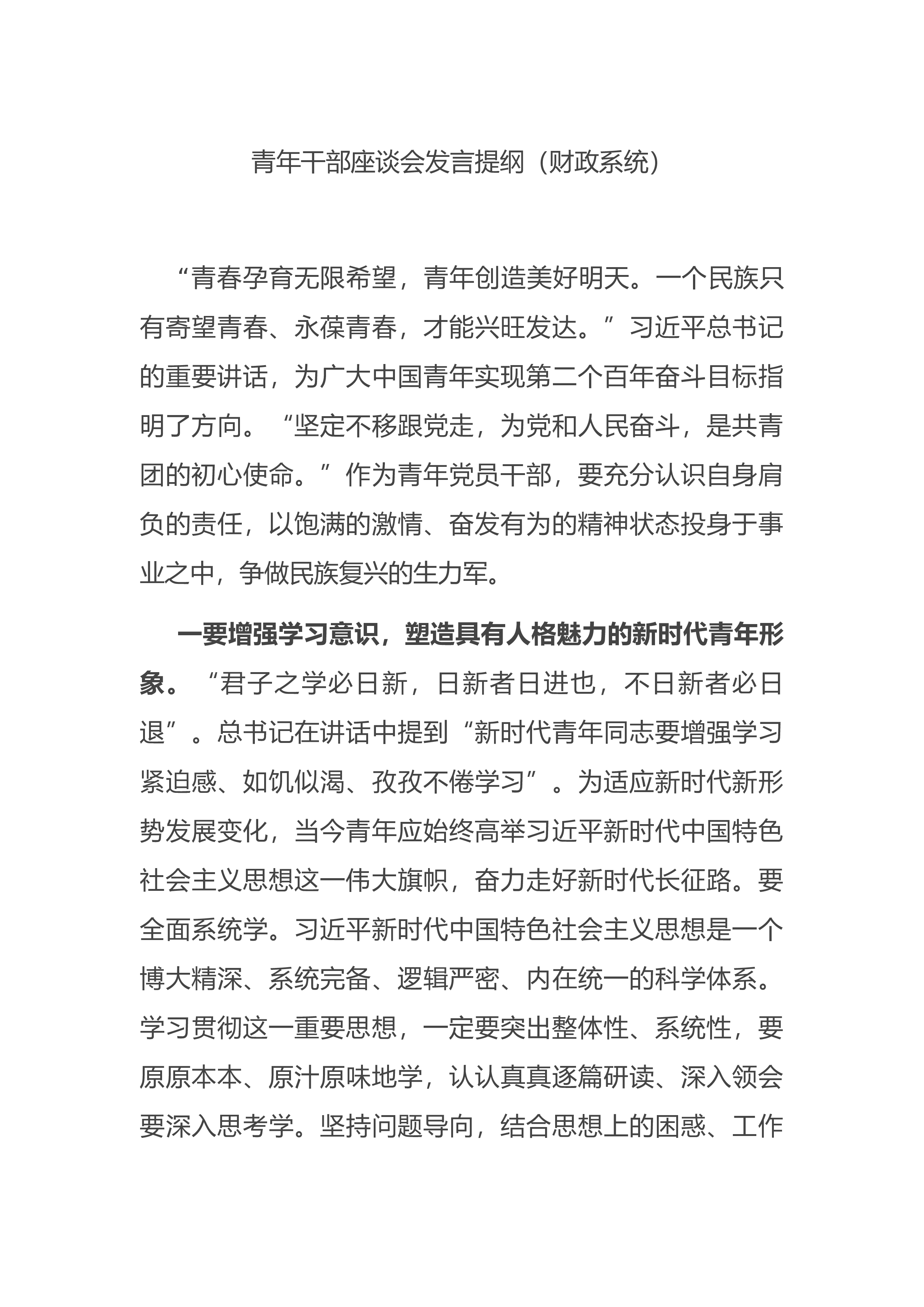 (财政系统)“青春孕育无限希望,青年创造美好明天。一个民族只有寄望青春、永葆青春,才能兴旺发达。”习近平总书记的重要讲话,为广大中国青年实现第二个百年奋斗目标指明了方向。“坚定不移跟党走,为党和人民奋斗,是共青团的初心使命。”作为青年党员干部,要充分认识自身肩负的责任,以饱满的激情、奋发有为的精神状态投身于事业之中,争做民族复兴的生力军。一要增强学习意识,塑造具有人格魅力的新时代青年形象。“君子之学必日新,日新者日进也,不日新者必日退”。总书记在讲话中提到“新时代青年同志要增强学习紧迫感、如饥似渴、孜孜不倦学习”。为适应新时代新形势发展变化,当今青年应始终高举习近平新时代...