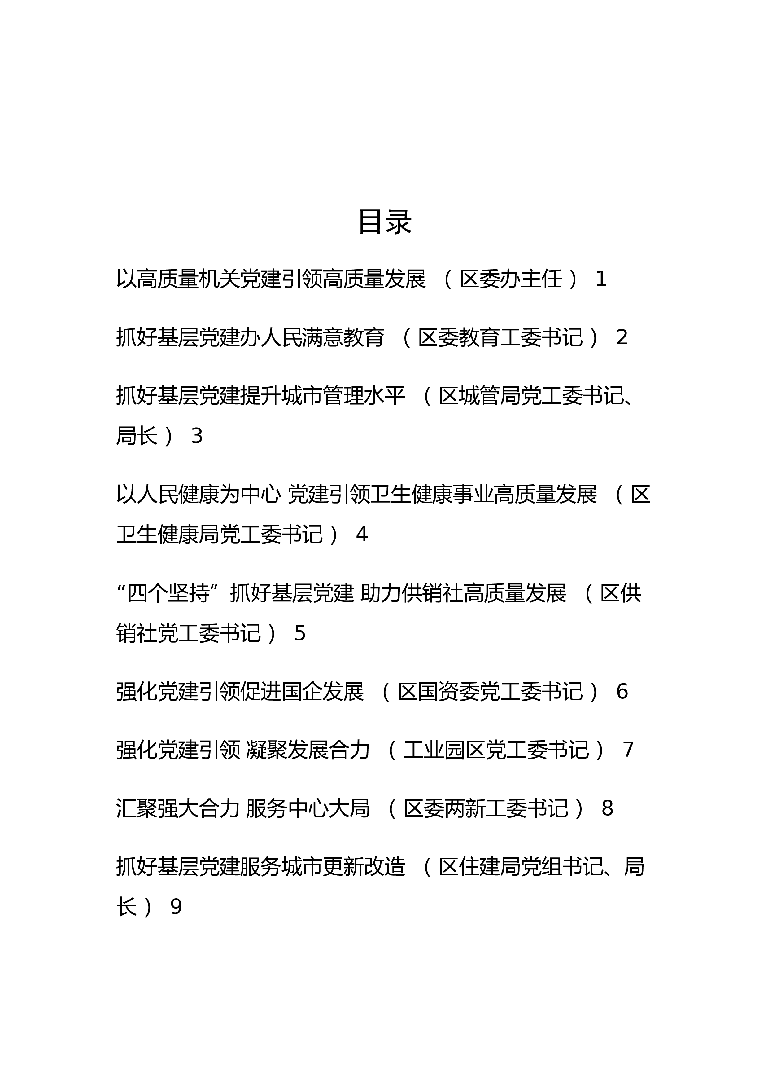 目录以高质量机关党建引领高质量发展(区委办主任)1抓好基层党建办人民满意教育(区委教育工委书记)2抓好基层党建提升城市管理水平(区城管局党工委书记、局长)3以人民健康为中心党建引领卫生健康事业高质量发展(区卫生健康局党工委书记)4“四个坚持”抓好基层党建助力供销社高质量发展(区供销社党工委书记)5强化党建引领促进国企发展(区国资委党工委书记)6强化党建引领凝聚发展合力(工业园区党工委书记)7汇聚强大合力服务中心大局(区委两新工委书记)8抓好基层党建服务城市更新改造(区住建局党组书记、局长)9筑牢主责强基础党建引领...
