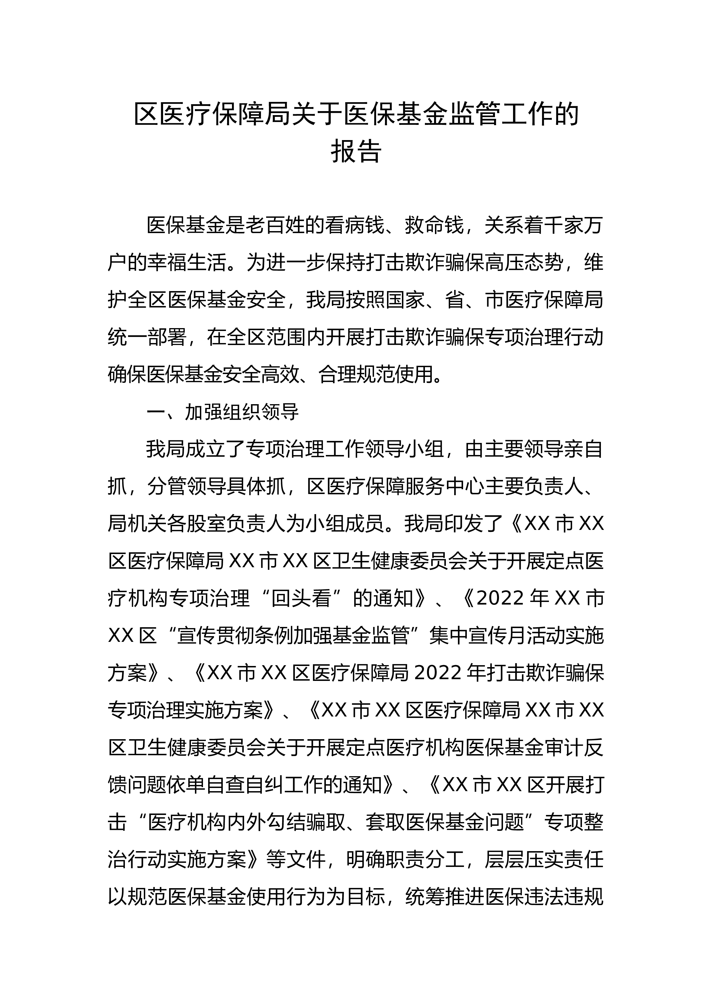 区医疗保障局关于医保基金监管工作的报告医保基金是老百姓的看病钱、救命钱,关系着千家万户的幸福生活。为进一步保持打击欺诈骗保高压态势,维护全区医保基金安全,我局按照国家、省、市医疗保障局统一部署,在全区范围内开展打击欺诈骗保专项治理行动确保医保基金安全高效、合理规范使用。一、加强组织领导我局成立了专项治理工作领导小组,由主要领导亲自抓,分管领导具体抓,区医疗保障服务中心主要负责人、局机关各股室负责人为小组成员。我局印发了《XX市XX区医疗保障局XX市XX区卫生健康委员会关于开展定点医疗机构专项治理“回头看”的通知》、《2022年XX市XX区“宣传贯彻条例加强基金监管”集中宣传月活动实施方案》、《...