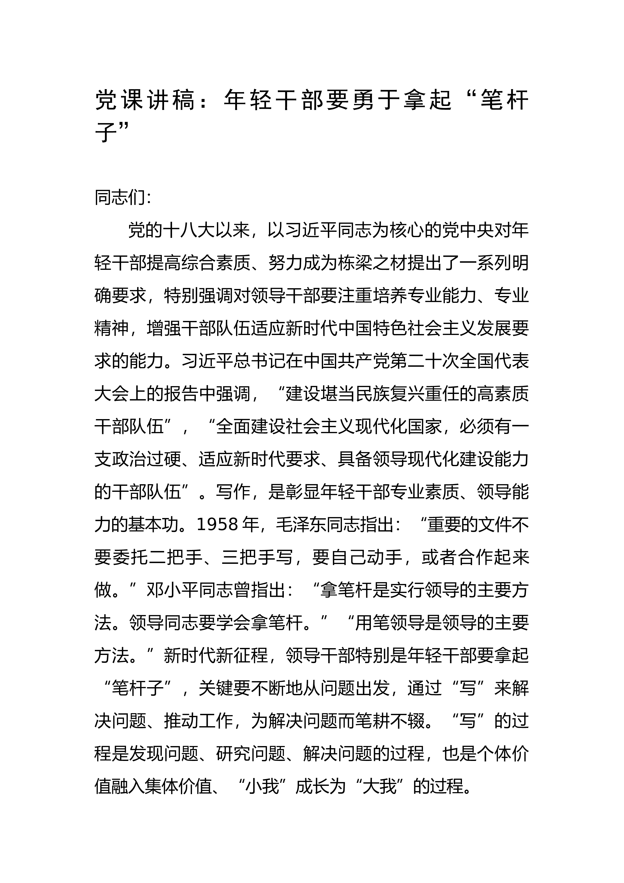党课讲稿:年轻干部要勇于拿起“笔杆子”同志们:党的十八大以来,以习近平同志为核心的党中央对年轻干部提高综合素质、努力成为栋梁之材提出了一系列明确要求,特别强调对领导干部要注重培养专业能力、专业精神,增强干部队伍适应新时代中国特色社会主义发展要求的能力。习近平总书记在中国共产党第二十次全国代表大会上的报告中强调,“建设堪当民族复兴重任的高素质干部队伍”,“全面建设社会主义现代化国家,必须有一支政治过硬、适应新时代要求、具备领导现代化建设能力的干部队伍”。写作,是彰显年轻干部专业素质、领导能力的基本功。1958年,毛泽东同志指出:“重要的文件不要委托二把手、三把手写,要自己动手,或者合作起来做。”...
