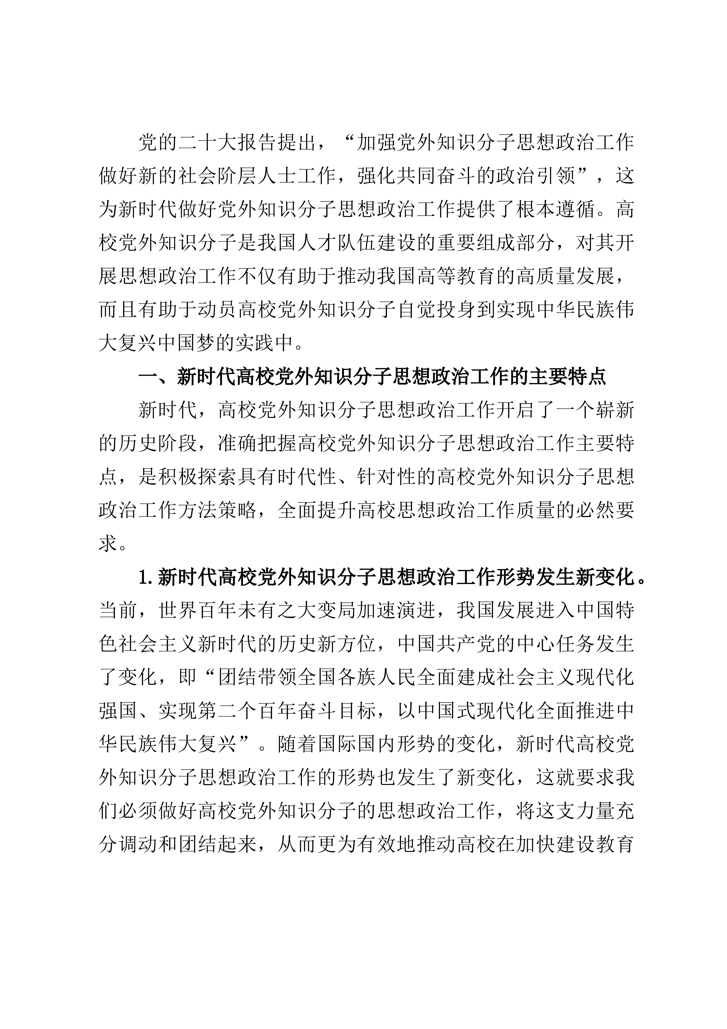 党的二十大报告提出,“加强党外知识分子思想政治工作做好新的社会阶层人士工作,强化共同奋斗的政治引领”,这为新时代做好党外知识分子思想政治工作提供了根本遵循。高校党外知识分子是我国人才队伍建设的重要组成部分,对其开展思想政治工作不仅有助于推动我国高等教育的高质量发展,而且有助于动员高校党外知识分子自觉投身到实现中华民族伟大复兴中国梦的实践中。一、新时代高校党外知识分子思想政治工作的主要特点新时代,高校党外知识分子思想政治工作开启了一个崭新的历史阶段,准确把握高校党外知识分子思想政治工作主要特点,是积极探索具有时代性、针对性的高校党外知识分子思想政治工作方法策略,全面提升高校思想政治工作质量的必然...