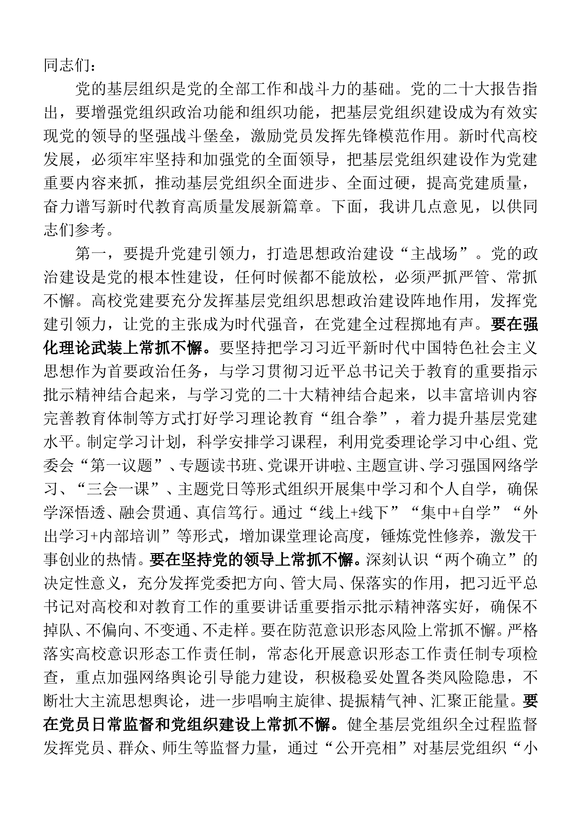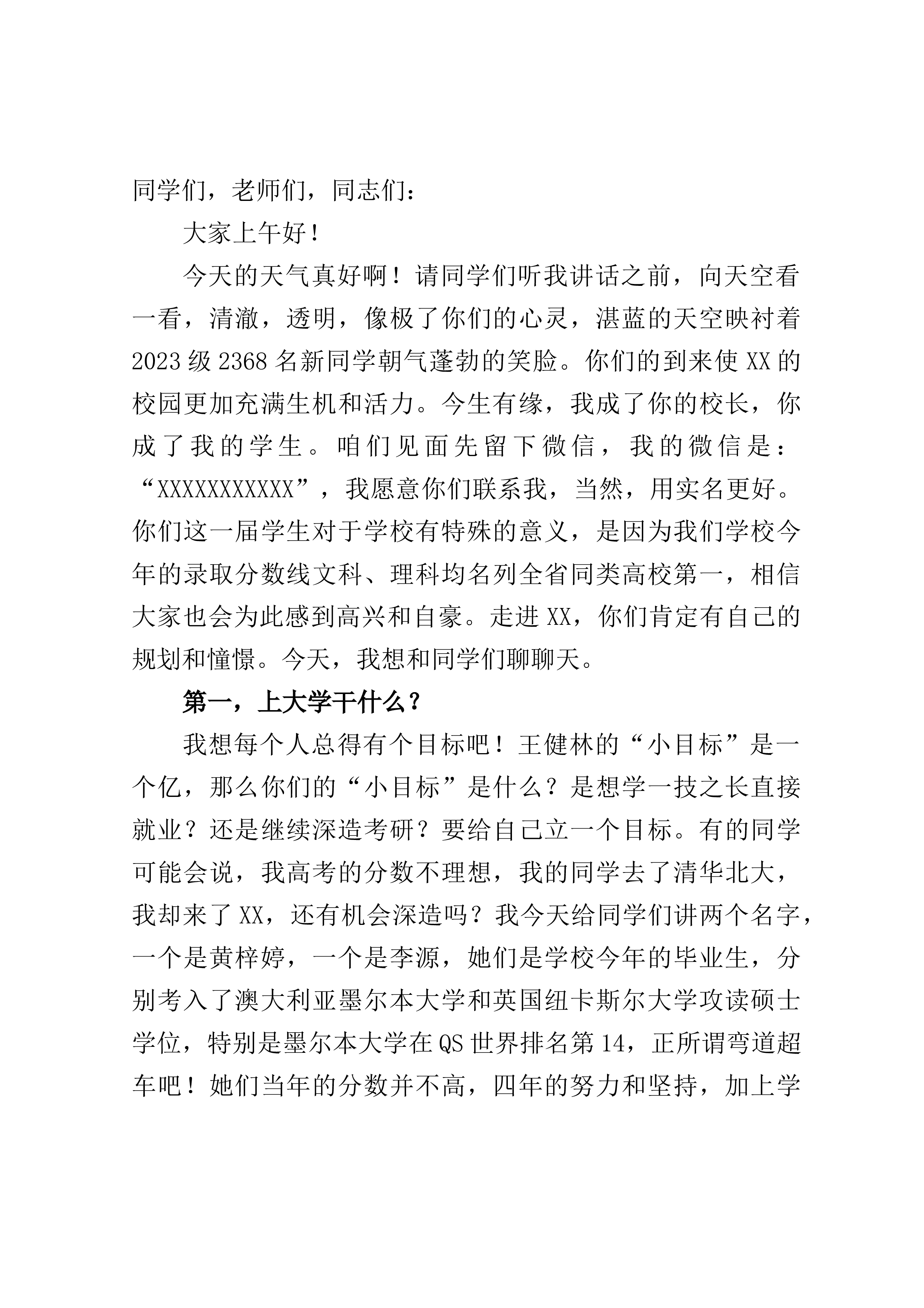 同学们,老师们,同志们:大家上午好!今天的天气真好啊!请同学们听我讲话之前,向天空看一看,清澈,透明,像极了你们的心灵,湛蓝的天空映衬着2023级2368名新同学朝气蓬勃的笑脸。你们的到来使XX的校园更加充满生机和活力。今生有缘,我成了你的校长,你成了我的学生。咱们见面先留下微信,我的微信是:“XXXXXXXXXXX”,我愿意你们联系我,当然,用实名更好。你们这一届学生对于学校有特殊的意义,是因为我们学校今年的录取分数线文科、理科均名列全省同类高校第一,相信大家也会为此感到高兴和自豪。走进XX,你们肯定有自己的规划和憧憬。今天,我想和同学们聊聊天。第一,上大学干什么?我想每个人总得有个目标吧!...