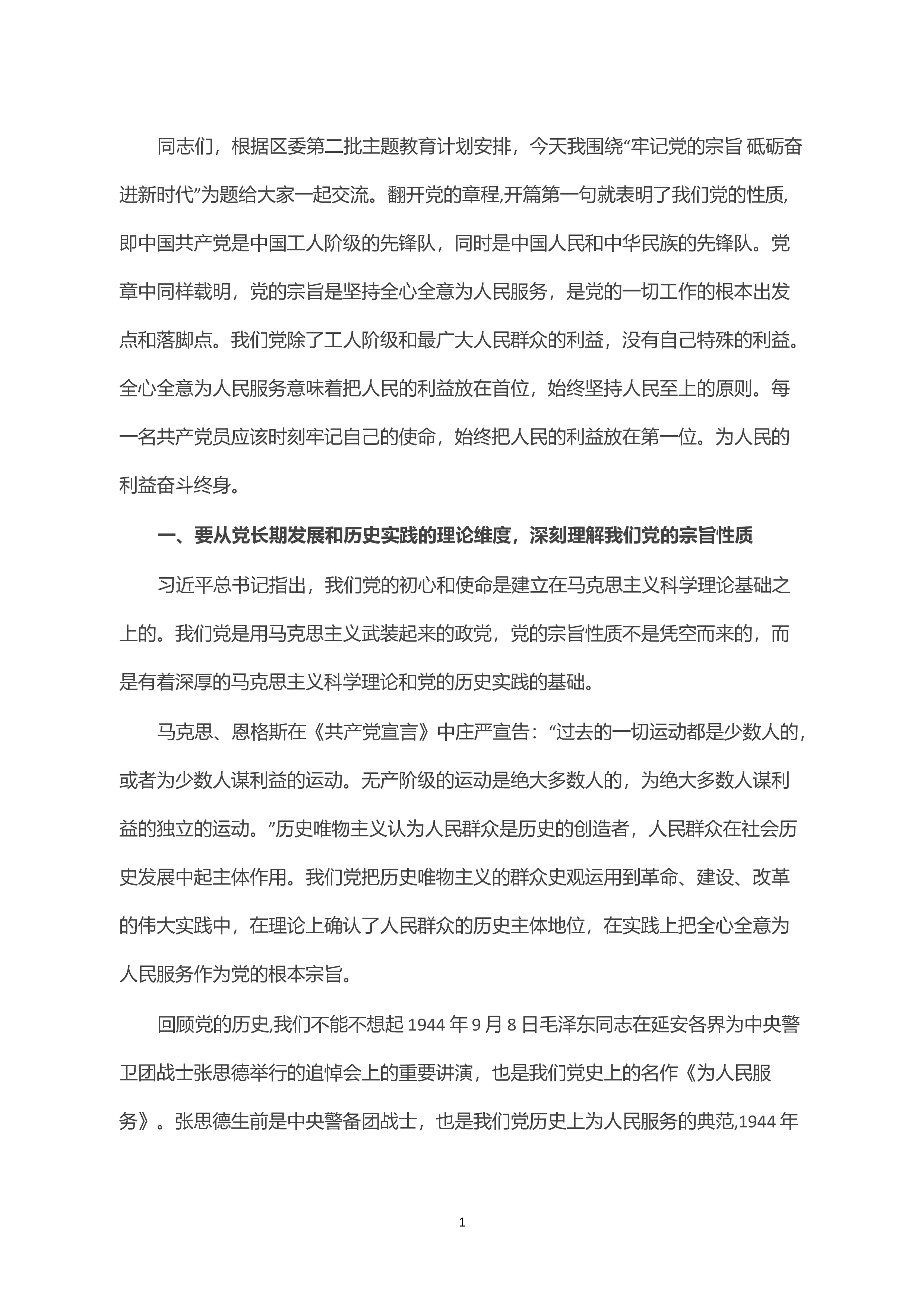 同志们,根据区委第二批主T教育计划安排,今天我围绕“牢记党的宗旨砥砺奋进新时代”为题给大家一起交流。翻开党的章程,开篇第一句就表明了我们党的性质,即中国共产党是中国工人阶级的先锋队,同时是中国人民和中华民族的先锋队。党章中同样载明,党的宗旨是坚持全心全意为人民服务,是党的一切工作的根本出发点和落脚点。我们党除了工人阶级和最广大人民群众的利益,没有自己特殊的利益。全心全意为人民服务意味着把人民的利益放在首位,始终坚持人民至上的原则。每一名