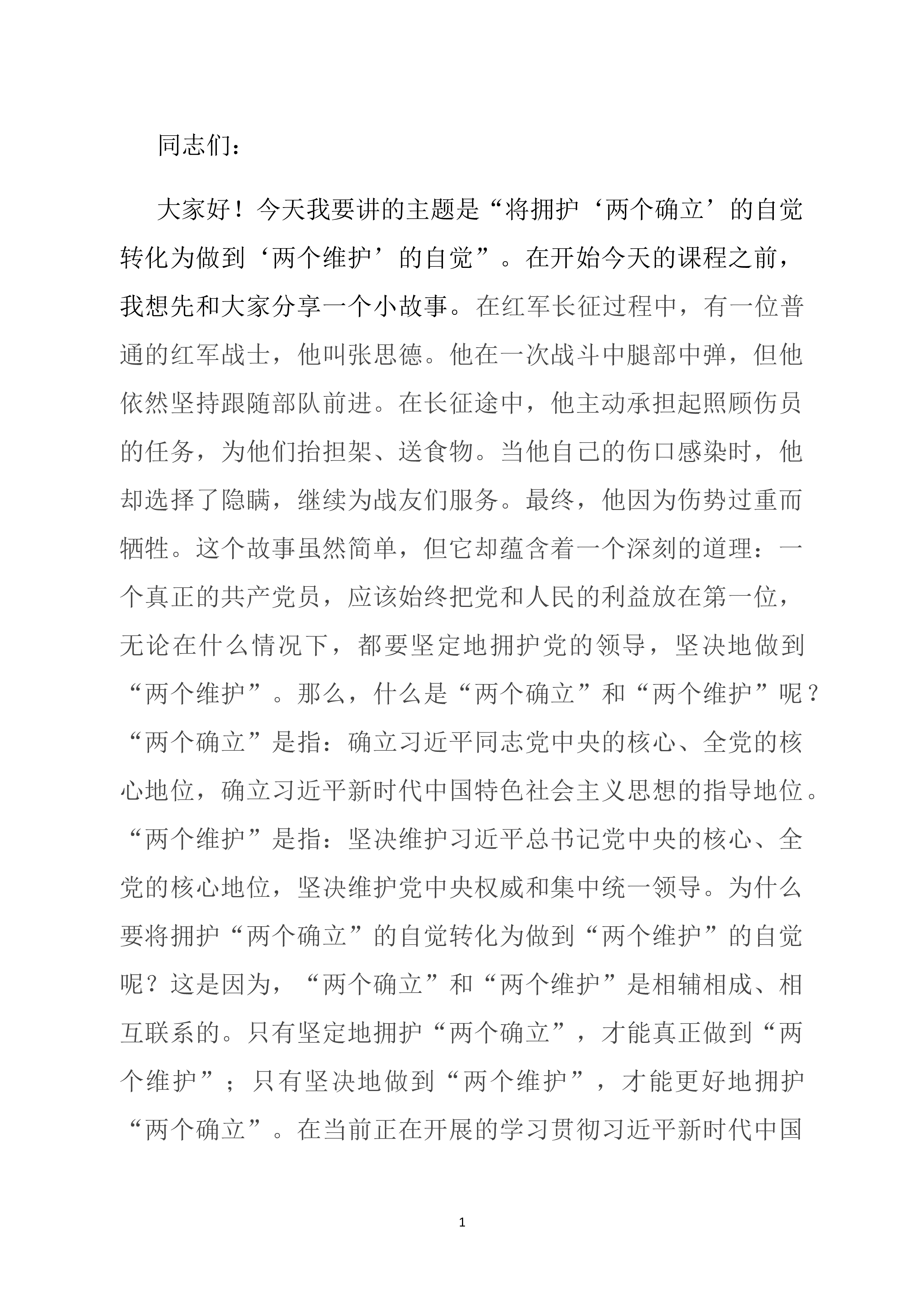 同志们:大家好!今天我要讲的主题是“将拥护‘两个确立’的自觉转化为做到‘两个维护’的自觉”。在开始今天的课程之前,我想先和大家分享一个小故事。在红军长征过程中,有一位普通的红军战士,他叫张思德。他在一次战斗中腿部中弹,但他依然坚持跟随部队前进。在长征途中,他主动承担起照顾伤员的任务,为他们抬担架、送食物。当他自己的伤口感染时,他却选择了隐瞒,继续为战友们服务。最终,他因为伤势过重而牺牲。这个故事虽然简单,但它却蕴含着一个深刻的道理:一个真正的