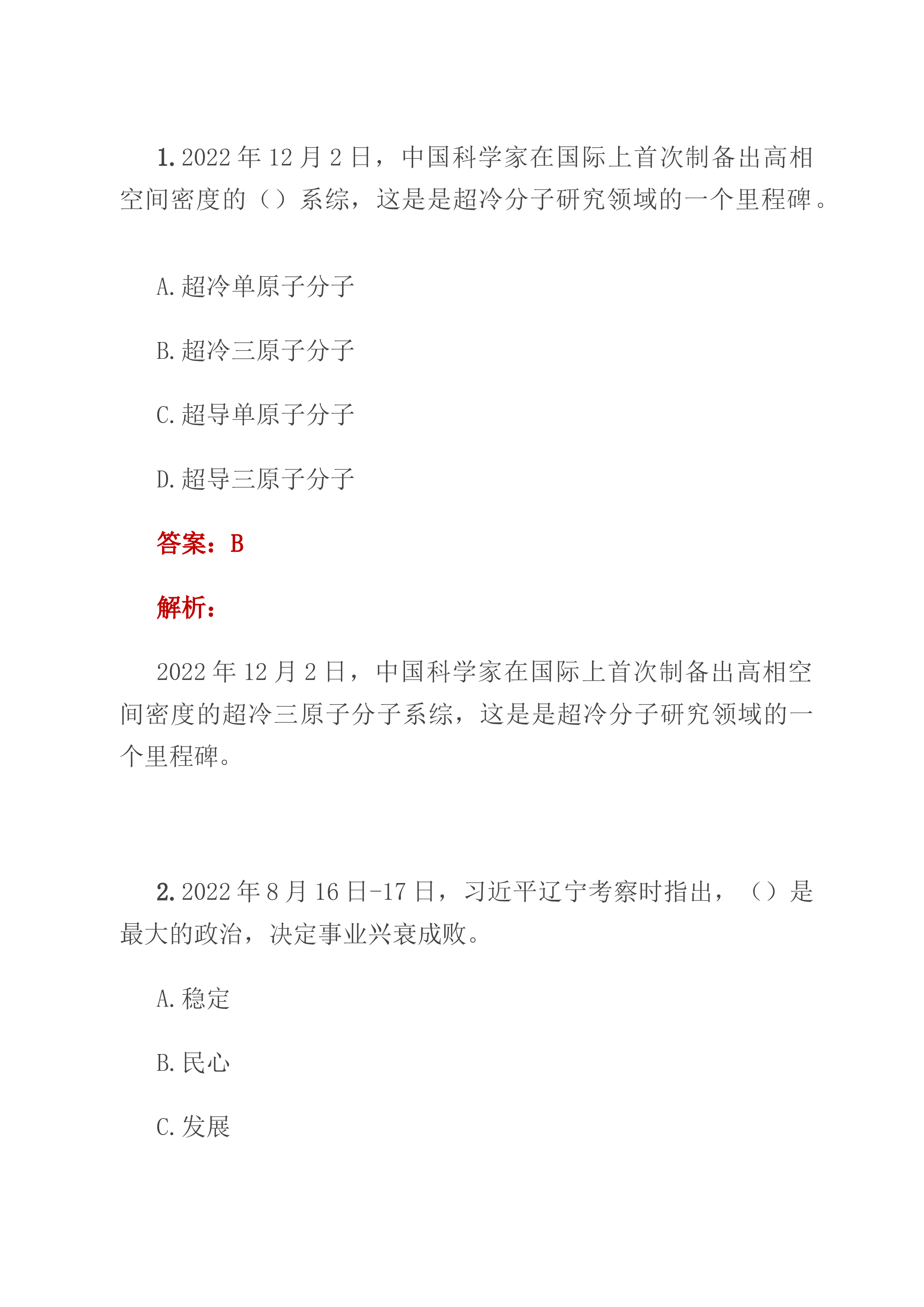 1.2022年12月2日,中国科学家在国际上首次制备出高相空间密度的()系综,这是是超冷分子研究领域的一个里程碑。A.超冷单原子分子B.超冷三原子分子C.超导单原子分子D.超导三原子分子答案:B解析:2022年12月2日,中国科学家在国际上首次制备出高相空间密度的超冷三原子分子系综,这是是超冷分子研究领域的一个里程碑。2.2022年8月16日-17日,习近平辽宁考察时指出,()是最大的政治,决定事业兴衰成败。A.稳定B.民心C.发展D.经济答案:B解析:习近平指出,民心是最大的政治,决定事业兴衰成败。3.“治其本,朝令而夕从救其末,百世不改也”出自苏轼的《关陇游民私铸钱与江淮漕卒为盗之由》,意...