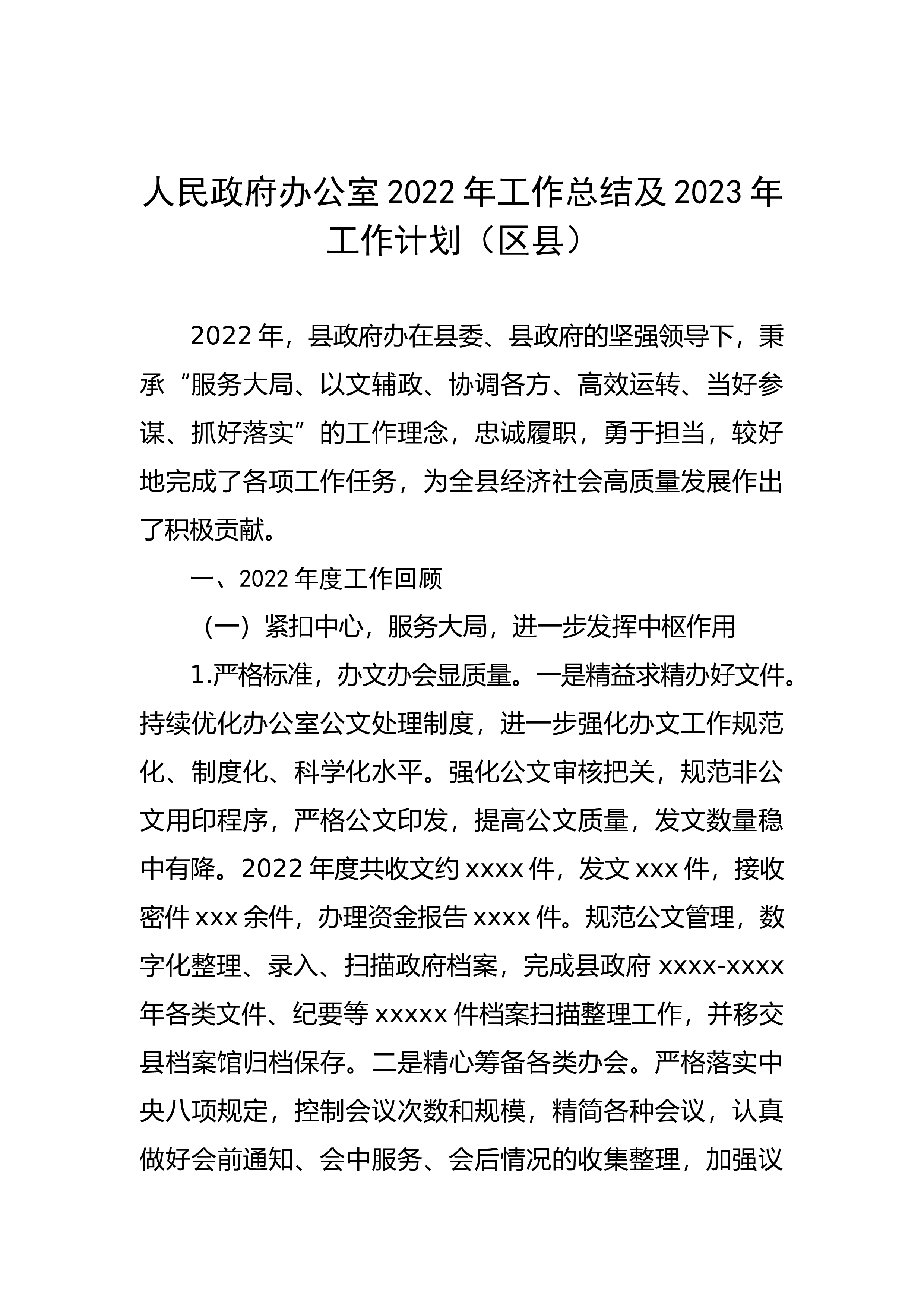 人民政府办公室2022年工作总结及2023年工作计划(区县)2022年,县政府办在县委、县政府的坚强领导下,秉承“服务大局、以文辅政、协调各方、高效运转、当好参谋、抓好落实”的工作理念,忠诚履职,勇于担当,较好地完成了各项工作任务,为全县经济社会高质量发展作出了积极贡献。一、2022年度工作回顾(一)紧扣中心,服务大局,进一步发挥中枢作用1.严格标准,办文办会显质量。一是精益求精办好文件。持续优化办公室公文处理制度,进一步强化办文工作规范化、制度化、科学化水平。强化公文审核把关,规范非公文用印程序,严格公文印发,提高公文质量,发文数量稳中有降。2022年度共收文约xxxx件,发文xxx件,接收...