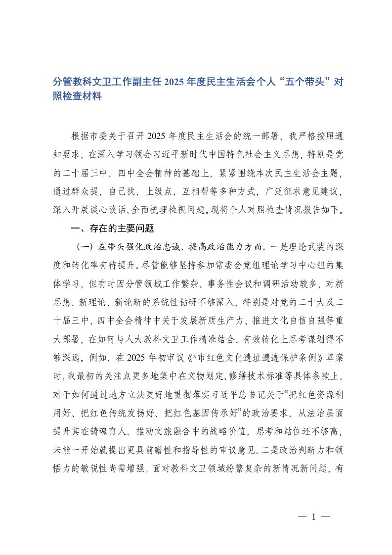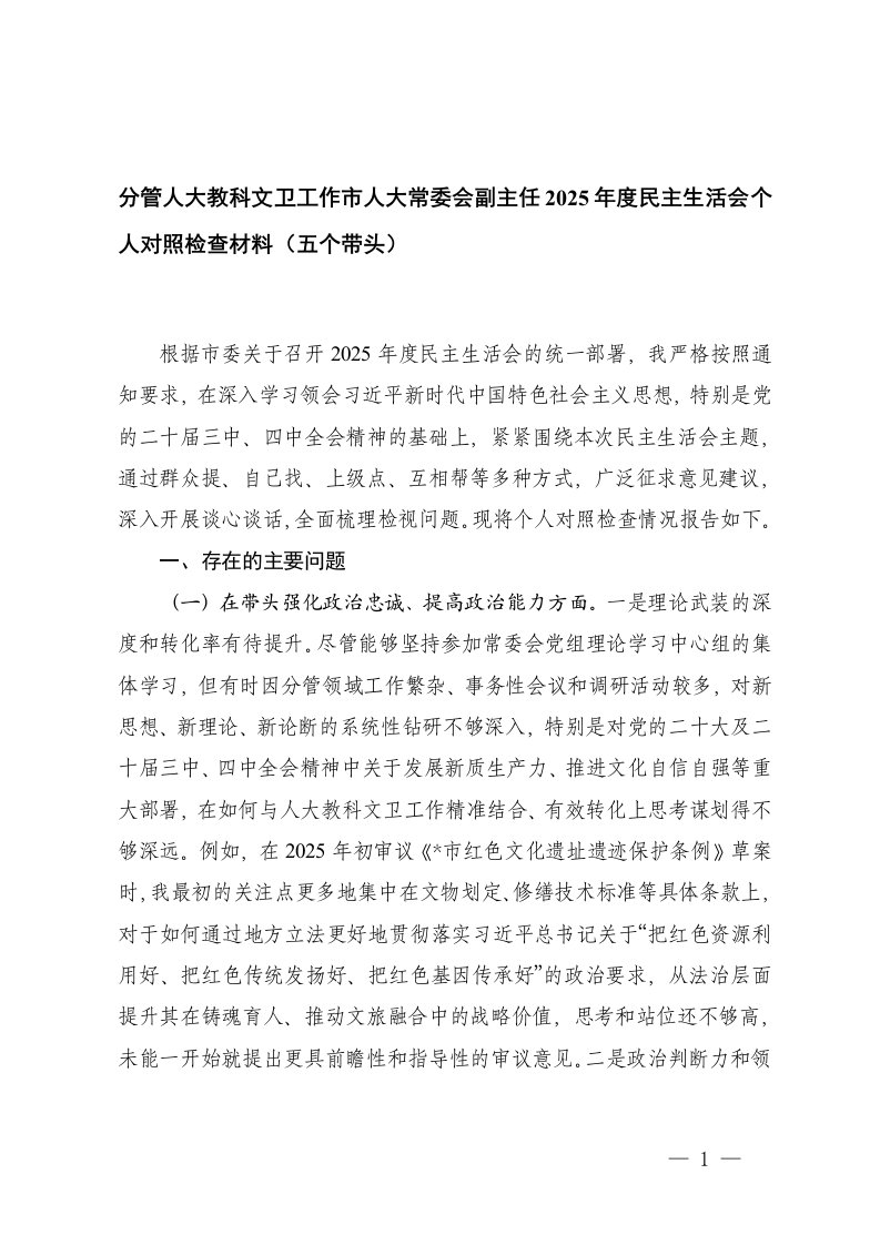 市人大常委会副主任2025年度民主生活会个人对照检查材料五个带头民主生活会,对照检查材料,对照检查,五个带头,