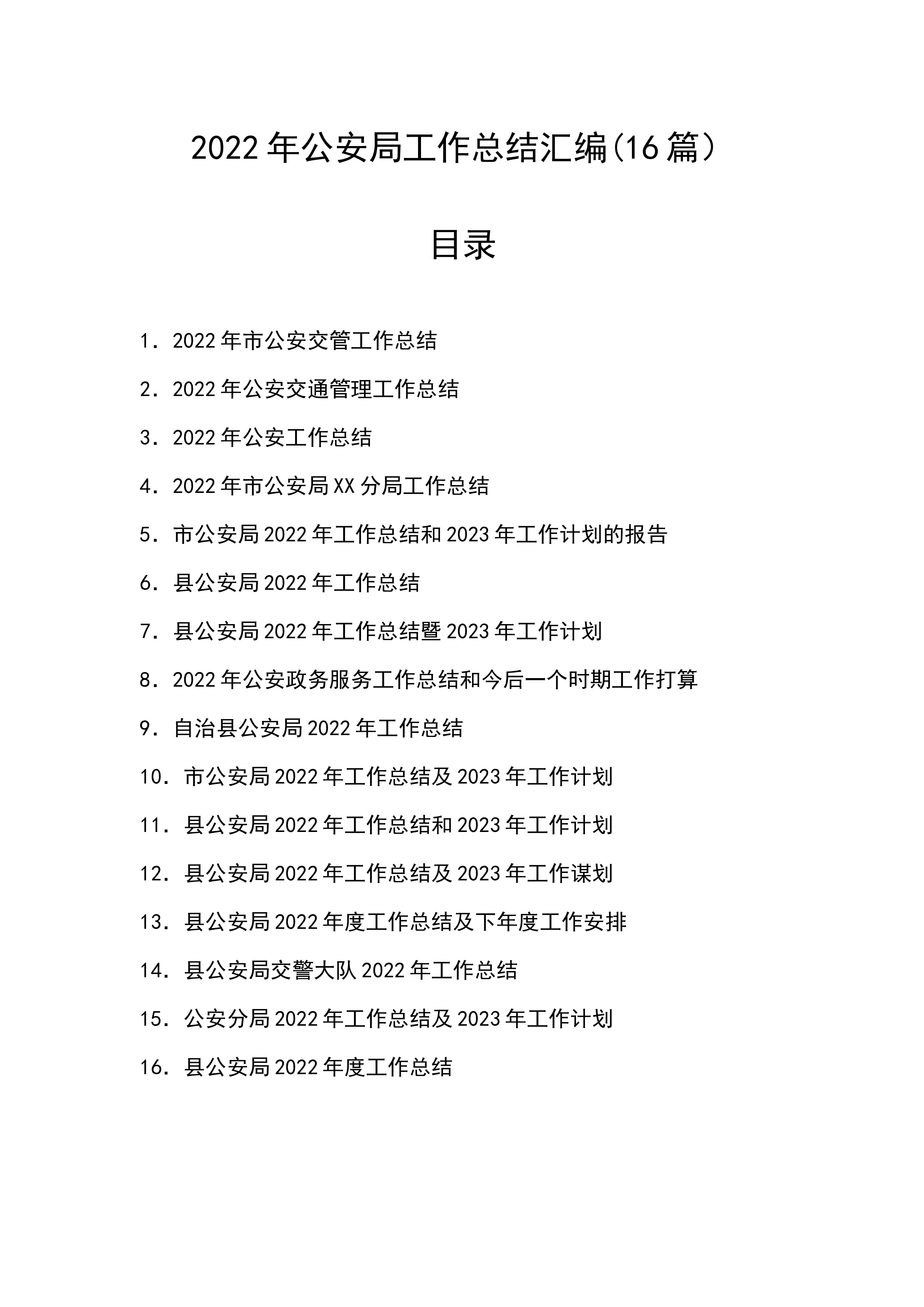 2022年公安局工作总结汇编(16篇)目录1.2022年市公安交管工作总结2.2022年公安交通管理工作总结3.2022年公安工作总结4.2022年市公安局XX分局工作总结5.市公安局2022年工作总结和2023年工作计划的报告6.县公安局2022年工作总结7.县公安局2022年工作总结暨2023年工作计划8.2022年公安政务服务工作总结和今后一个时期工作打算9.自治县公安局2022年工作总结10.市公安局2022年工作总结及2023年工作计划11.县公安局2022年工作总结和2023年工作计划12.县公安局2022年工作总结及2023年工作谋划13.县公安局2022年度工作总结及下年度工作...
