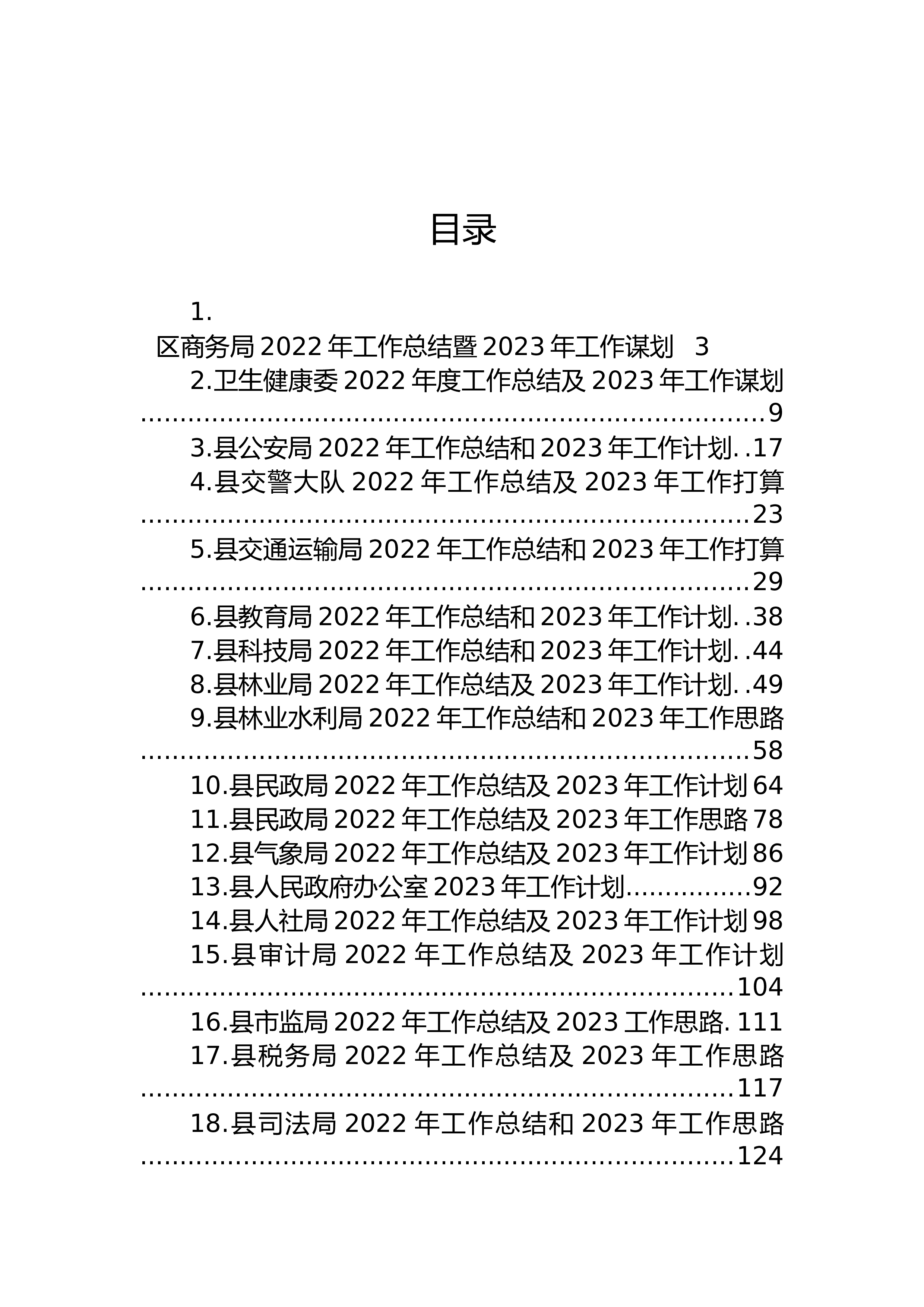 目录1.区商务局2022年工作总结暨2023年工作谋划32.卫生健康委2022年度工作总结及2023年工作谋划...............................................................................93.县公安局2022年工作总结和2023年工作计划..174.县交警大队2022年工作总结及2023年工作打算.............................................................................235.县交通运输局2022年工作总结和2023年工作打算.......