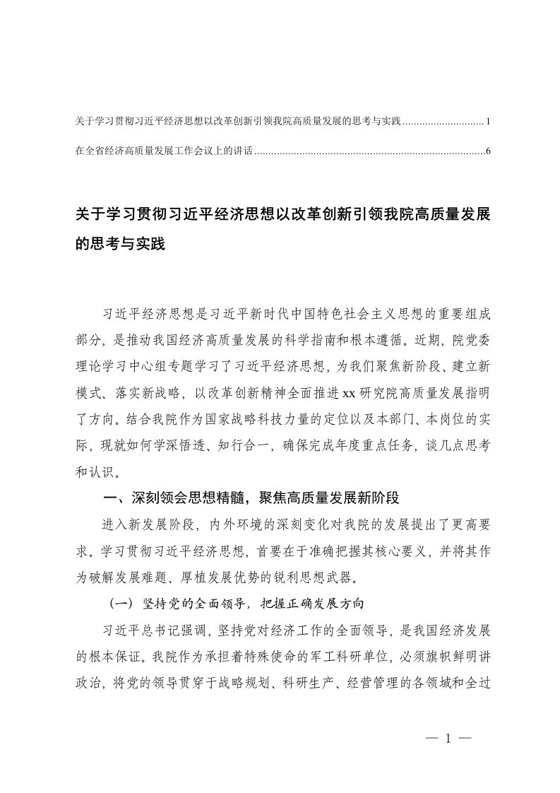 2025年关于学习贯彻习近平经济思想以改革创新引领我院高质量发展的思考与实践在全省经济高质量发展