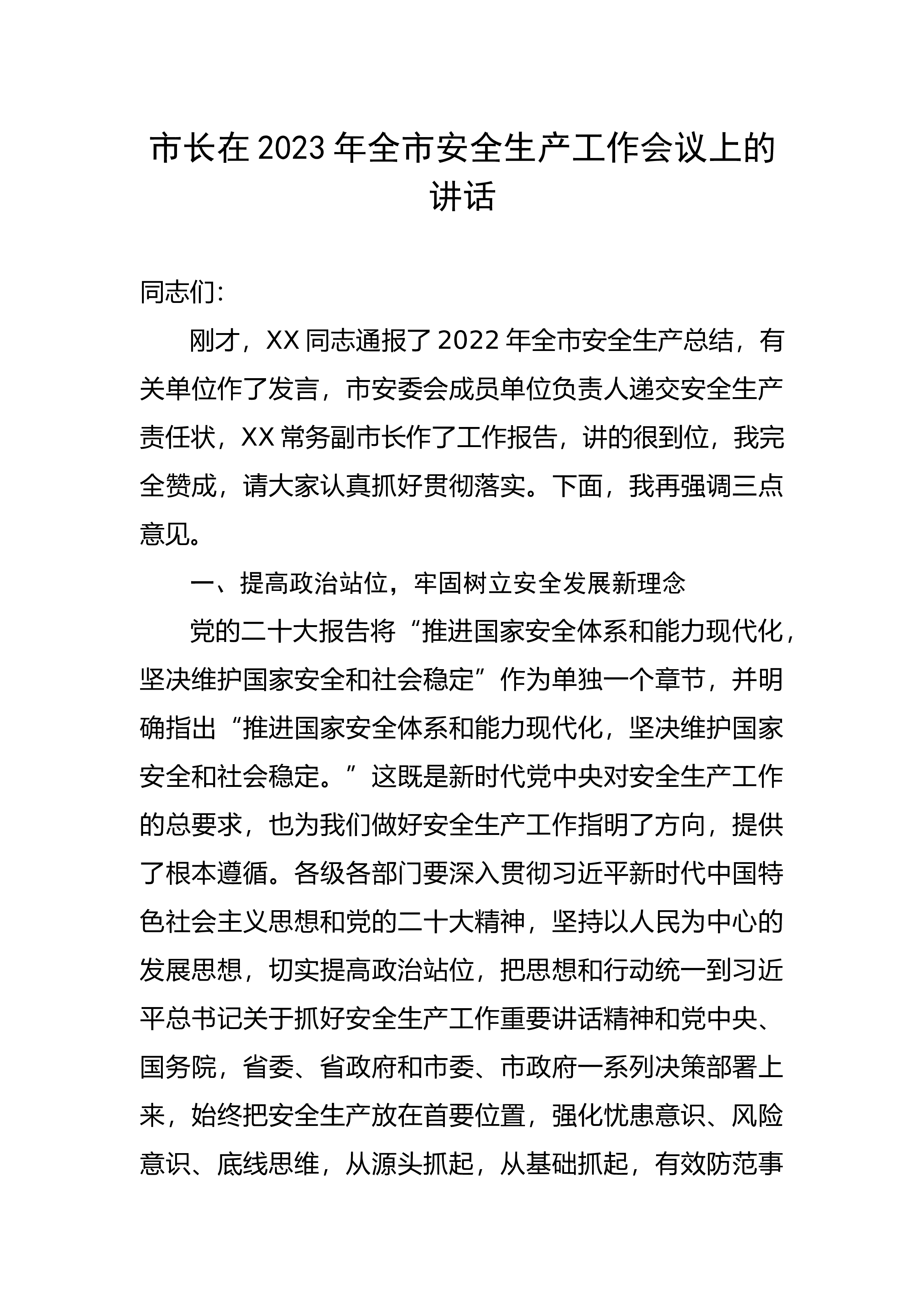 上的讲话同志们:刚才,XX同志通报了2022年全市安全生产总结,有关单位作了发言,市安委会成员单位负责人递交安全生产责任状,XX常务副市长作了工作报告,讲的很到位,我完全赞成,请大家认真抓好贯彻落实。下面,我再强调三点意见。一、提高政治站位,牢固树立安全发展新理念党的二十大报告将“推进国家安全体系和能力现代化,坚决维护国家安全和社会稳定”作为单独一个章节,并明确指出“推进国家安全体系和能力现代化,坚决维护国家安全和社会稳定。”这既是新时代党中央对安全生产工作的总要求,也为我们做好安全生产工作指明了方向,提供了根本遵循。各级各部门要深入贯彻习近平新时代中国特色...