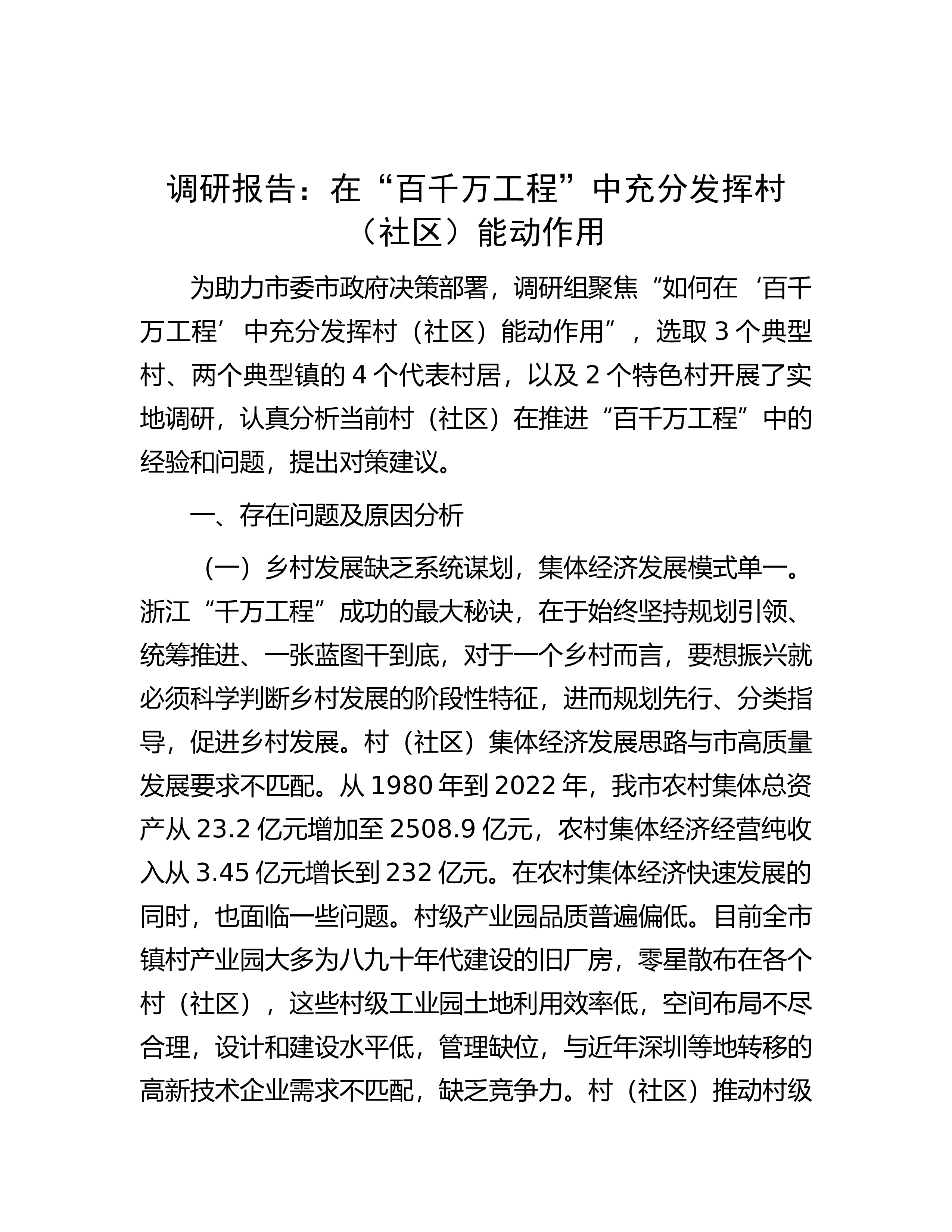 关于建设全省农业现代化先行区的调研报告按照主T教育调研工作安排,我围绕建设全省农业现代化先行区,先后深入农业企业、产业园区和村组实地调查,多次召开部门、乡镇领导参加的座谈会,梳理和研判全区农业发展的阶段性特征,在分析加快农业现代化存在的差距和机遇的基础上,就农业现代化建设及2024年农业农村工作思路和重点提出初步意见。一、基本情况自我区被认定为国家级现代农业示范区以来,全区上下按照“一区两带三产业”区域布局,坚持园区化、企业化、循环化和产业化的“四化”现代农业发展思路,举全区之力谋划建设现代农业,规划推进“十大产业园”建设,抓项目,夯实现代农业发展基础;建园区,打造现代农业发展的x模式;扩规模...