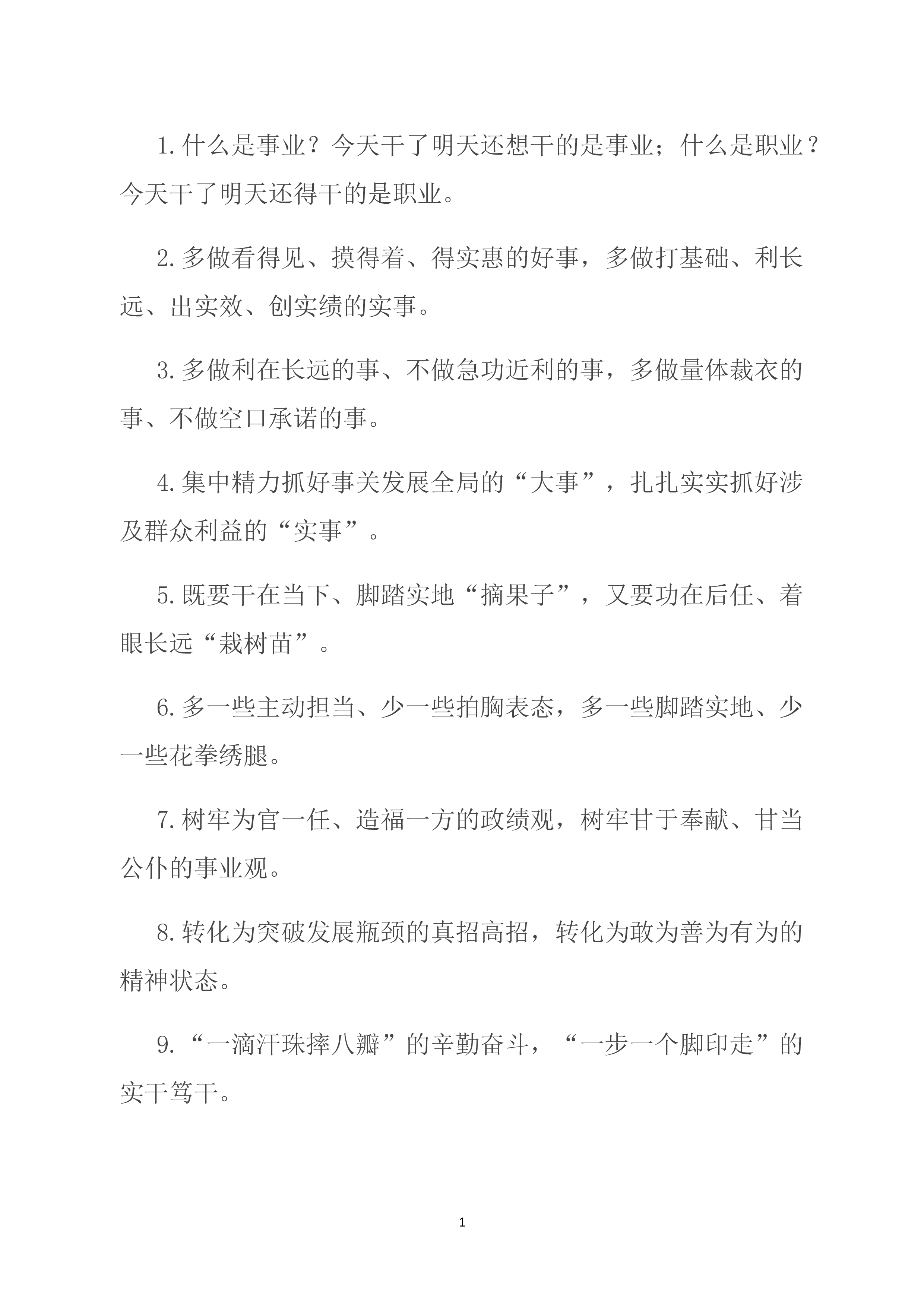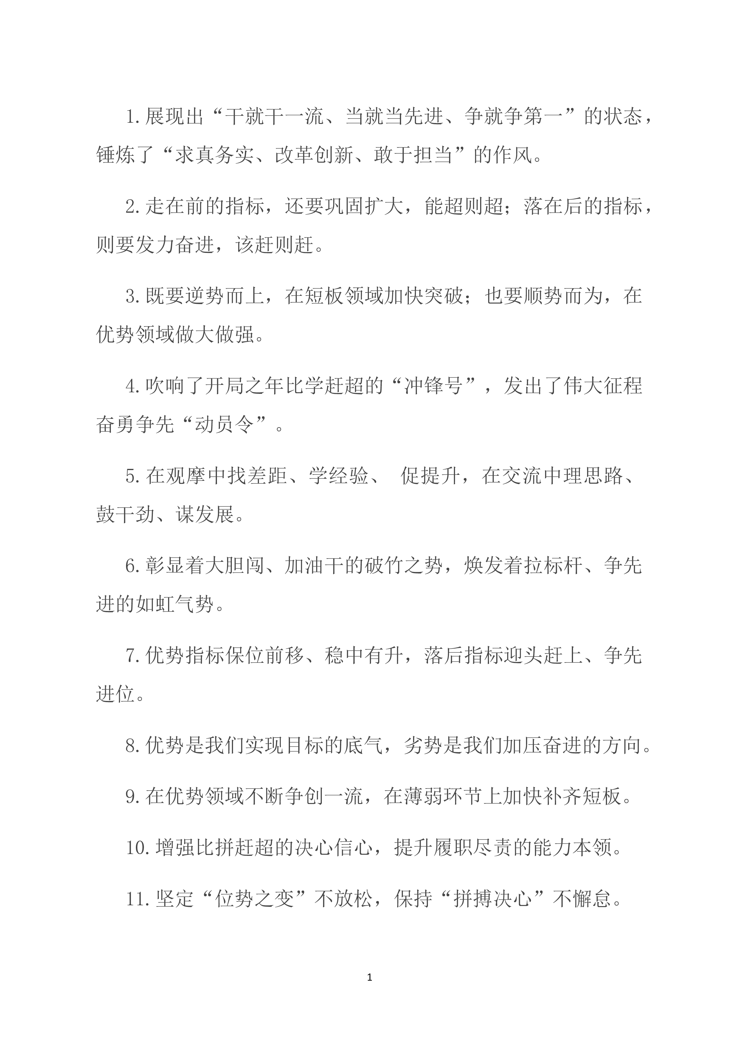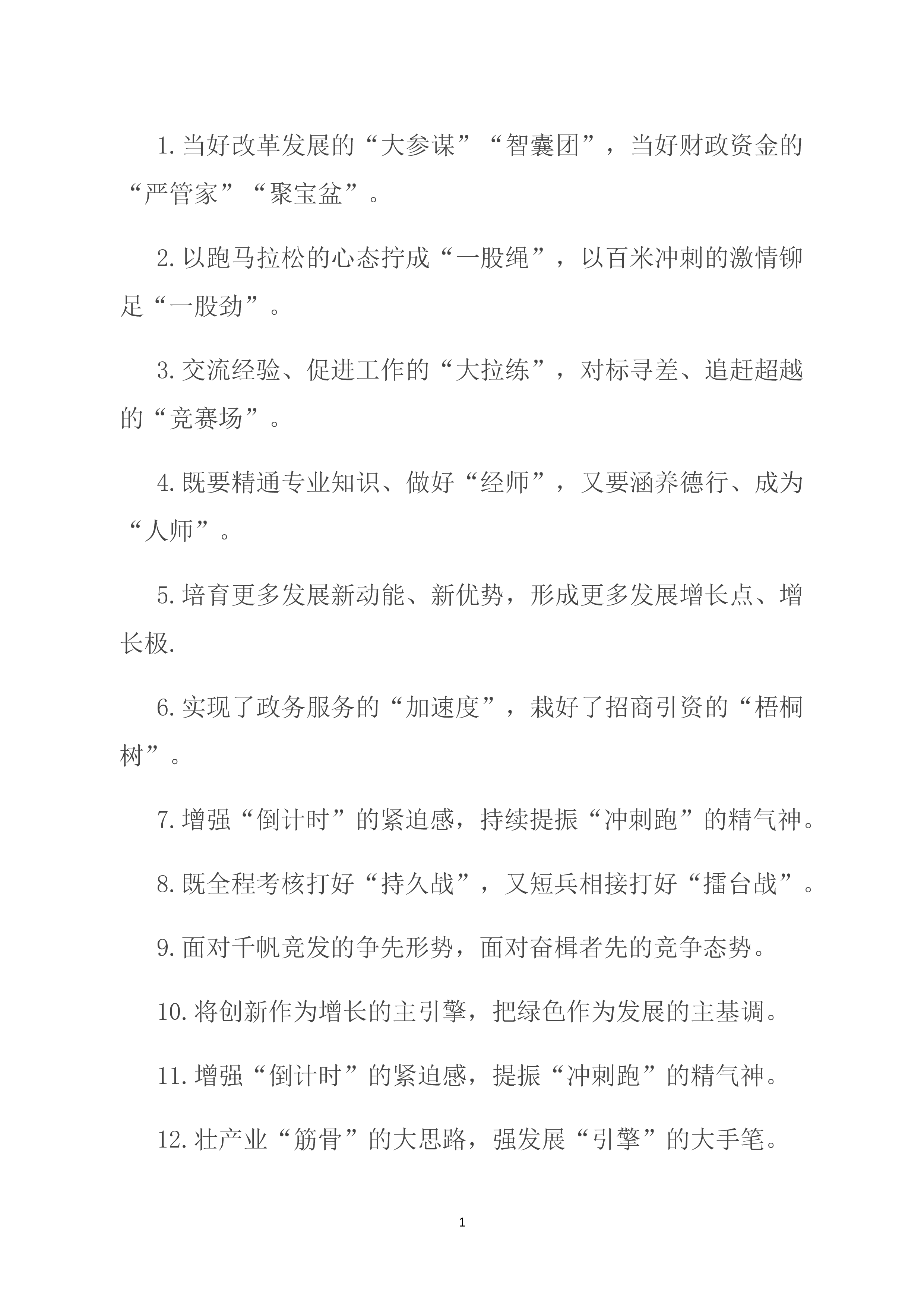 1.当好改革发展的“大参谋”“智囊团”,当好财政资金的“严管家”“聚宝盆”。2.以跑马拉松的心态拧成“一股绳”,以百米冲刺的激情铆足“一股劲”。3.交流经验、促进工作的“大拉练”,对标寻差、追赶超越的“竞赛场”。4.既要精通专业知识、做好“经师”,又要涵养德行、成为“人师”。5.培育更多发展新动能、新优势,形成更多发展增长点、增长极.6.实现了政务服务的“加速度”,栽好了招商引资的“梧桐树”。7.增强“倒计时”的紧迫感,持续提振“冲刺跑”的精气神。8.既全程考核打好“持久战”,又短兵相接打好“擂台战”。9.面对千帆竞发的争先形势,面对奋楫者先的竞争态势。10.将创新作为增长的主引擎,把绿色作为...