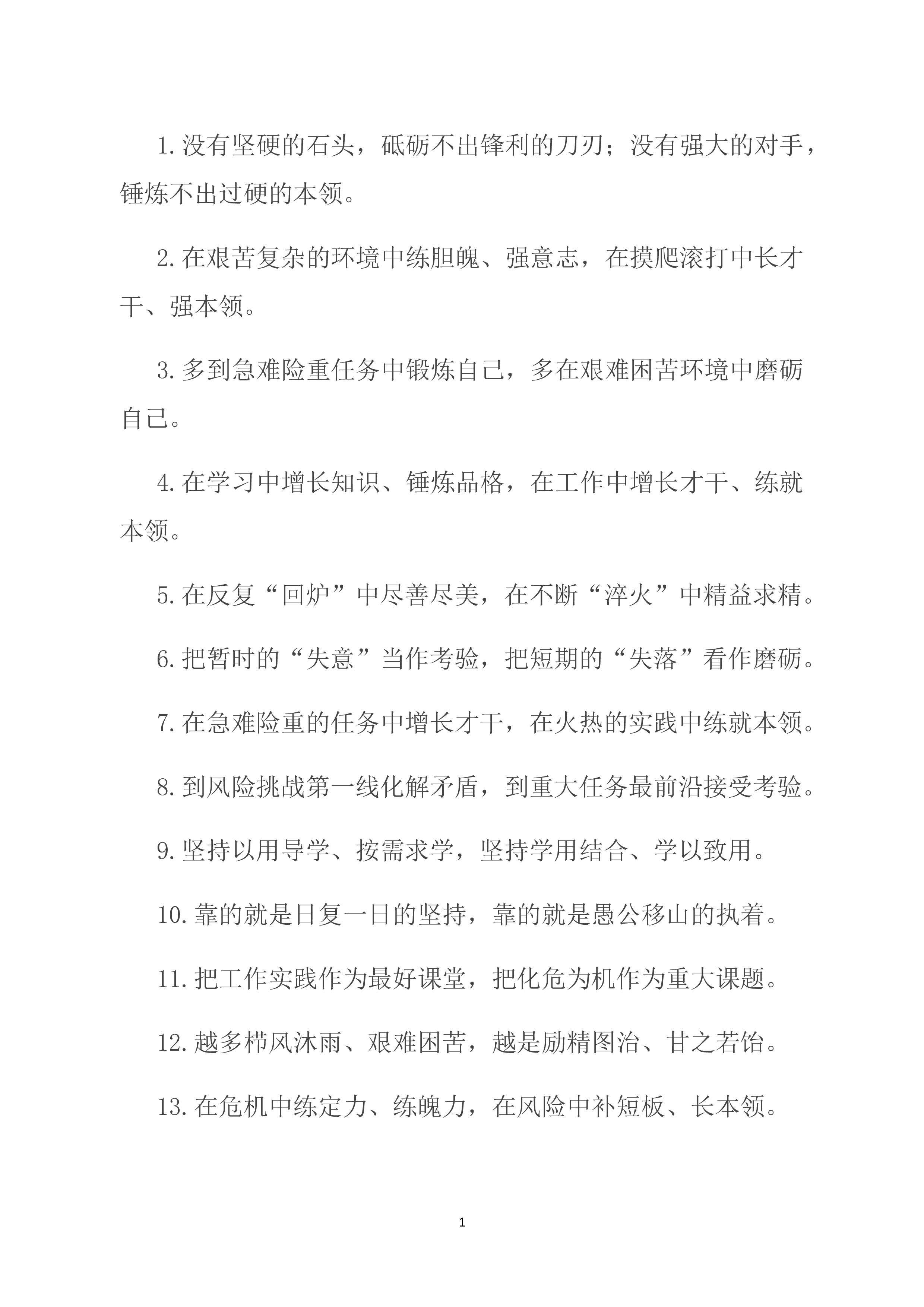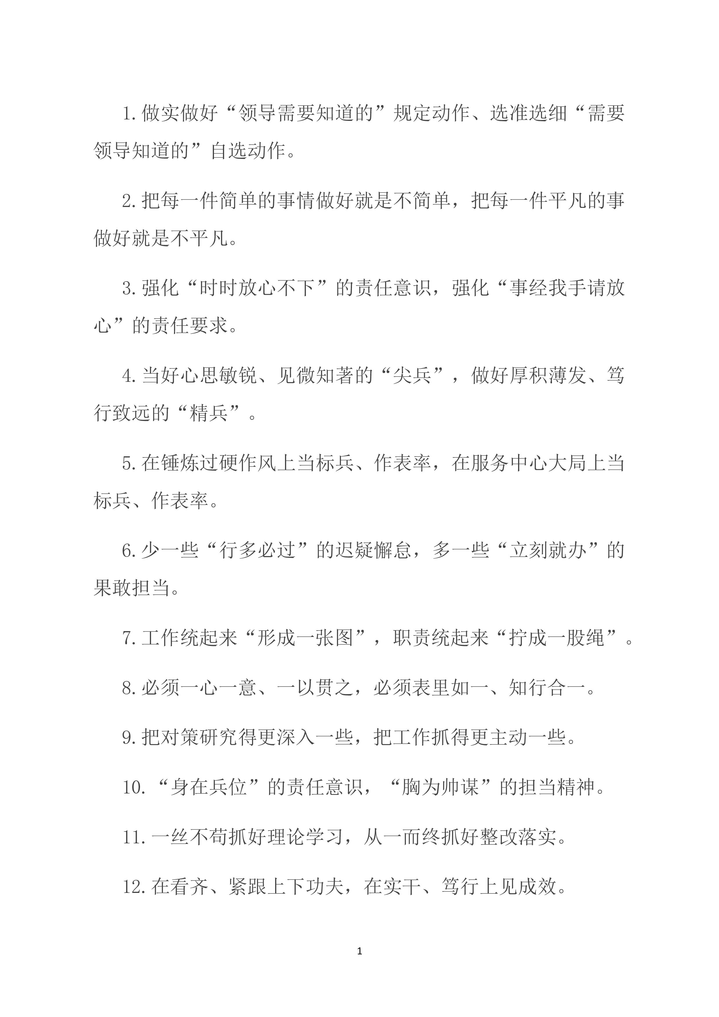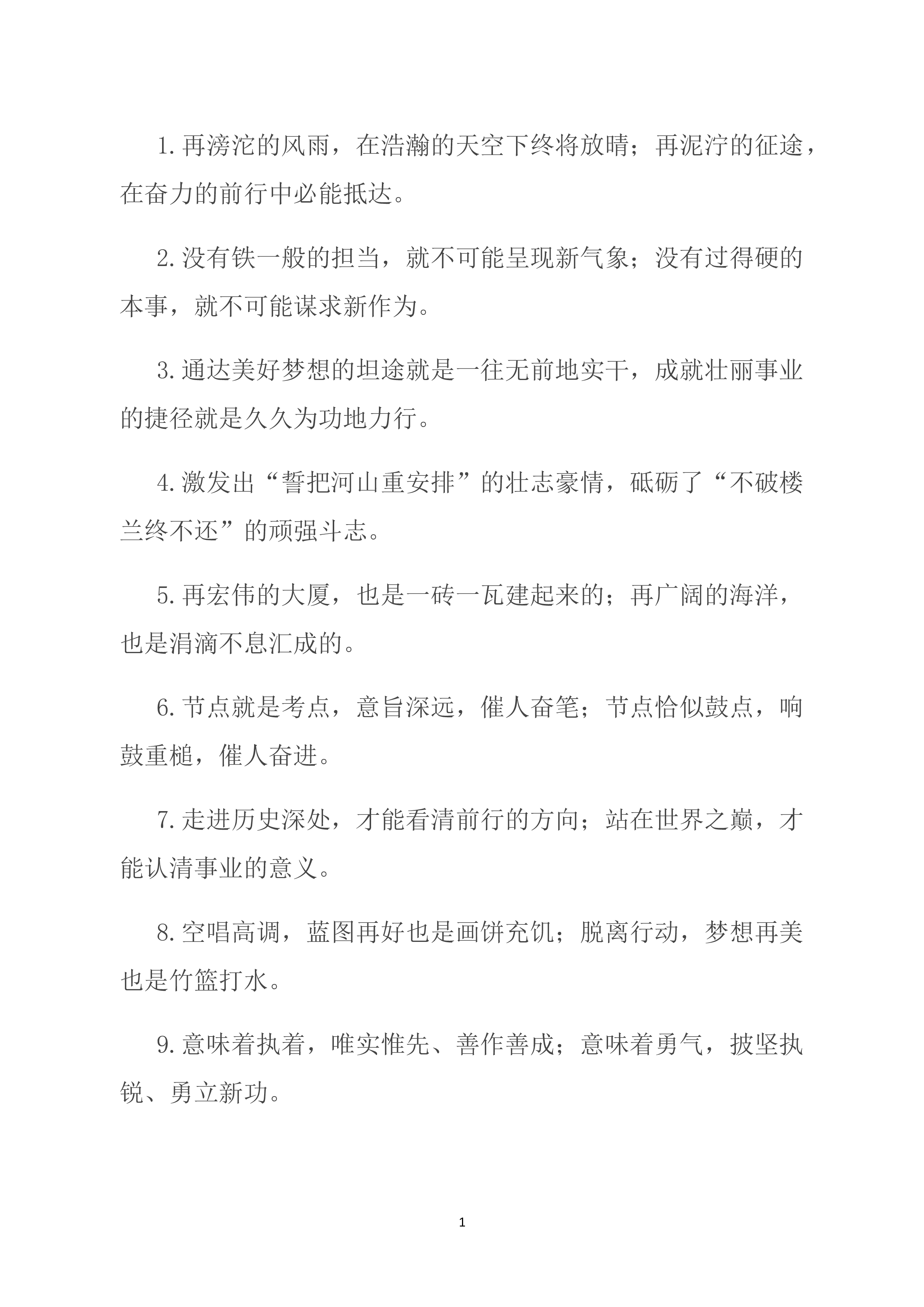 1.当好改革发展的“大参谋”“智囊团”,当好财政资金的“严管家”“聚宝盆”。2.以跑马拉松的心态拧成“一股绳”,以百米冲刺的激情铆足“一股劲”。3.交流经验、促进工作的“大拉练”,对标寻差、追赶超越的“竞赛场”。4.既要精通专业知识、做好“经师”,又要涵养德行、成为“人师”。5.培育更多发展新动能、新优势,形成更多发展增长点、增长极.6.实现了政务服务的“加速度”,栽好了招商引资的“梧桐树”。7.增强“倒计时”的紧迫感,持续提振“冲刺跑”的精气神。8.既全程考核打好“持久战”,又短兵相接打好“擂台战”。9.面对千帆竞发的争先形势,面对奋楫者先的竞争态势。10.将创新作为增长的主引擎,把绿色作为...