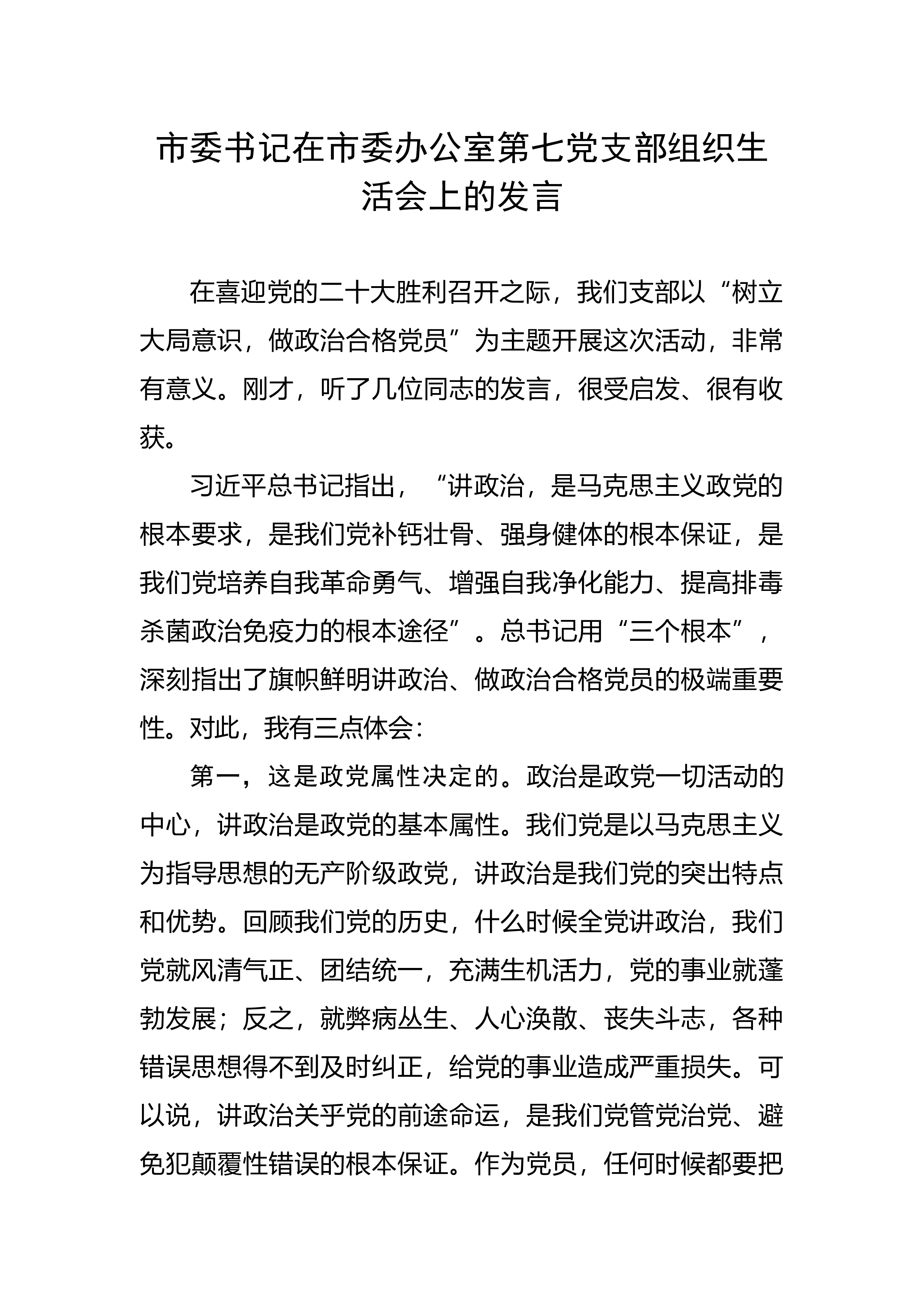 市委书记在市委办公室第七党支部组织生活会上的发言在喜迎党的二十大胜利召开之际,我们支部以“树立大局意识,做政治合格党员”为主题开展这次活动,非常有意义。刚才,听了几位同志的发言,很受启发、很有收获。习近平总书记指出,“讲政治,是马克思主义政党的根本要求,是我们党补钙壮骨、强身健体的根本保证,是我们党培养自我革命勇气、增强自我净化能力、提高排毒杀菌政治免疫力的根本途径”。总书记用“三个根本”,深刻指出了旗帜鲜明讲政治、做政治合格党员的极端重要性。对此,我有三点体会:第一,这是政党属性决定的。政治是政党一切活动的中心,讲政治是政党的基本属性。我们党是以马克思主义为指导思想的无产阶级政党,讲政治是我...