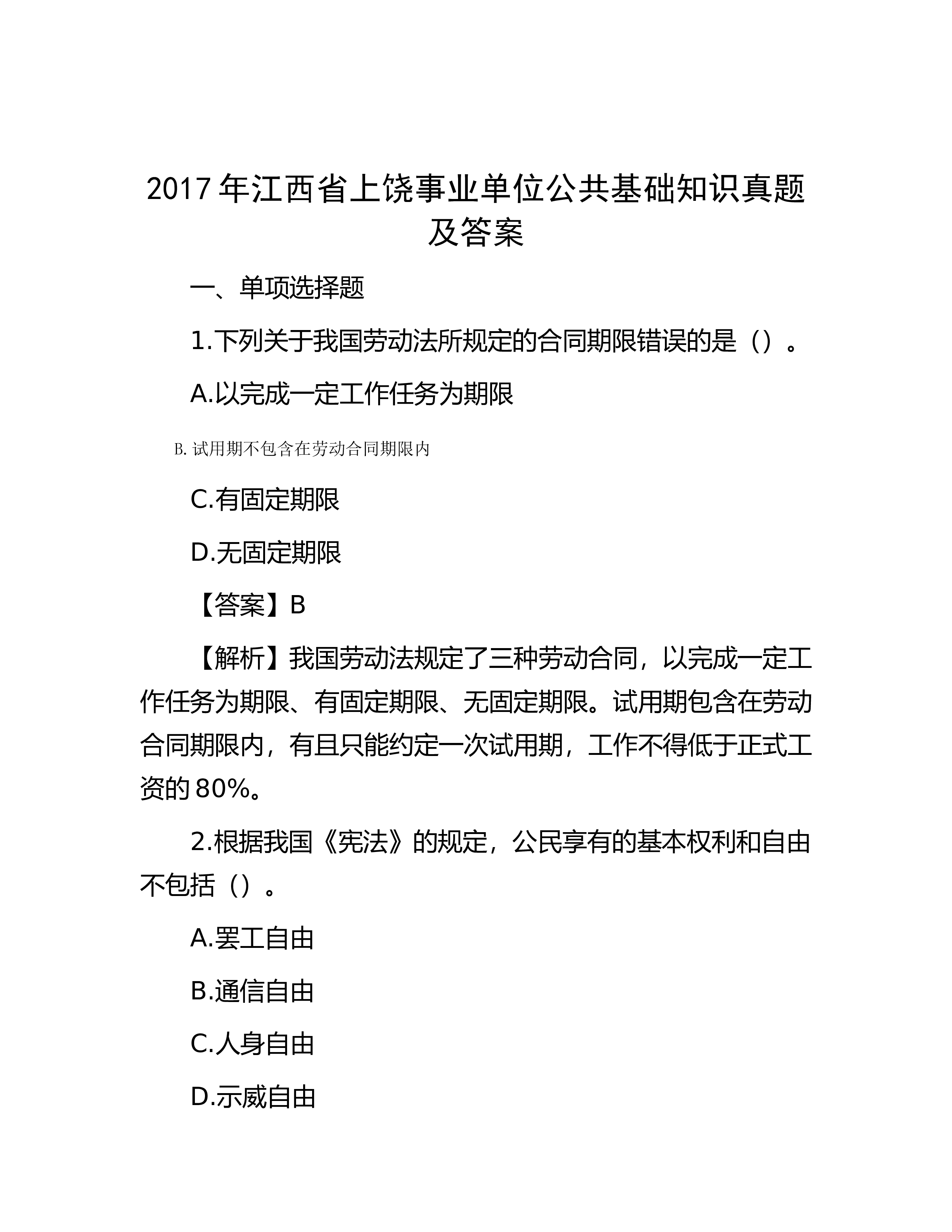 2013年江西省事业单位考试真题一、单项选择1.解决“三农”问题的根本途径是()A.高度重视粮食生产,扩大粮食种植面积B.增加对农业的人力物力财力的投入C.对农业和农村经济结构精华战略性调整D.实现农村税费改革,增加农民收入2.李某与某企业签订了劳动合同,在试用期内严重失职给企业造成重大损失,本人也受伤住院,该企业与李某的合同是()A.不可解除B.可以解除,在规定试用期满后解除C.可以解除,在劳动行政部同意后解除D.可以解除,在事故发生后可以随时解除3.改革开放以来,我国主要区域政策经历了不同的阶段:①以经济特区为重的沿海地区优先发展阶段。②以缩小区域差距为导向的西部大开发阶段。③以浦东开发为...