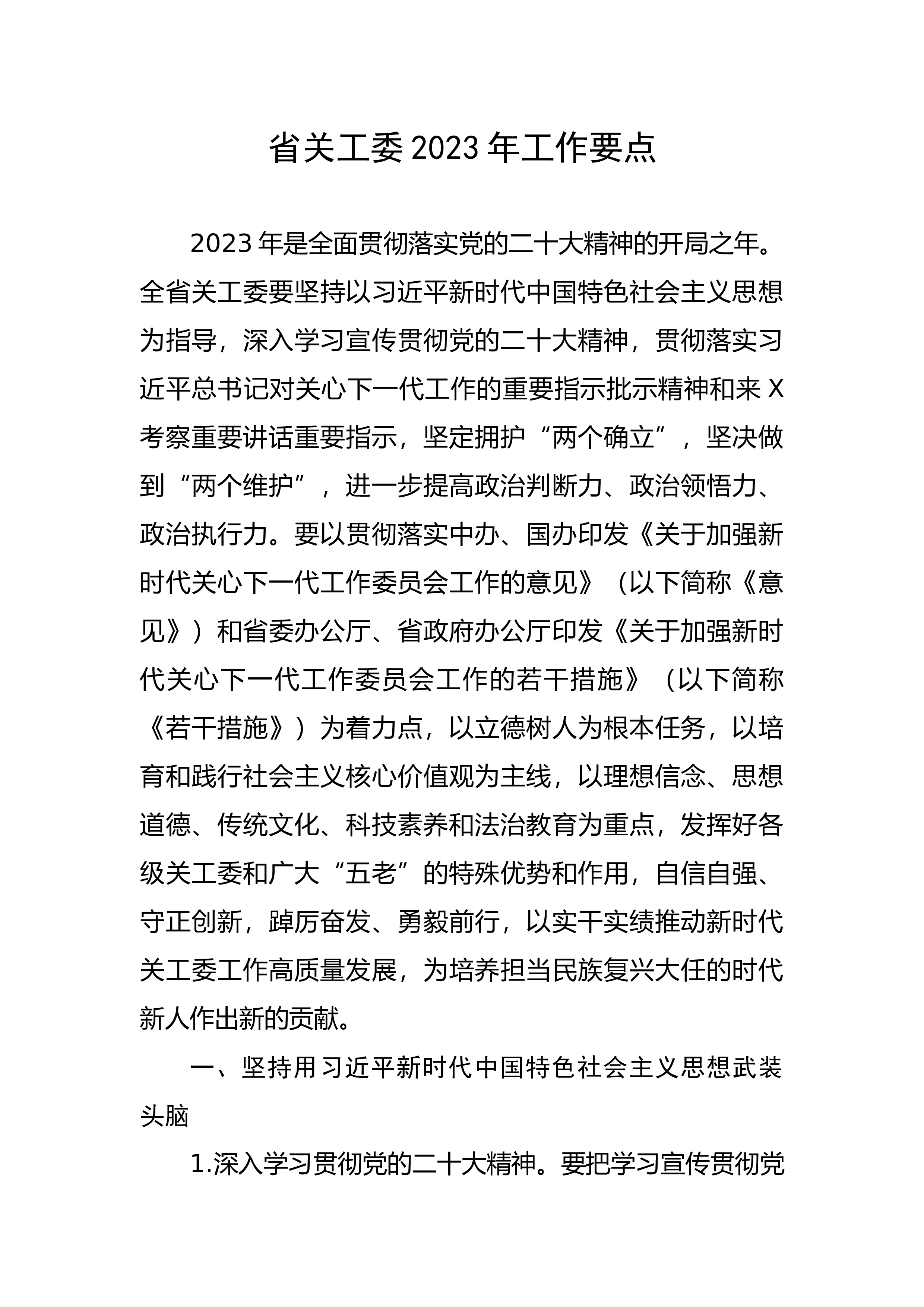 省关工委2023年工作要点2023年是全面贯彻落实党的二十大精神的开局之年。全省关工委要坚持以习近平新时代中国特色社会主义思想为指导,深入学习宣传贯彻党的二十大精神,贯彻落实习近平总书记对关心下一代工作的重要指示批示精神和来X考察重要讲话重要指示,坚定拥护“两个确立”,坚决做到“两个维护”,进一步提高政治判断力、政治领悟力、政治执行力。要以贯彻落实中办、国办印发《关于加强新时代关心下一代工作委员会工作的意见》(以下简称《意见》)和省委办公厅、省政府办公厅印发《关于加强新时代关心下一代工作委员会工作的若干措施》(以下简称《若干措施》)为着力点,以立德树人为根本任务,以培育和践行社会主义核心价值观...
