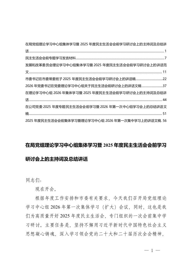 在党组理论学习中心组集体学习暨2025年度民主生活会会前学习研讨会上的主持词及总结讲话民主生活会,主持词,总结,讲话,理论学习,党组,理论学习中心组,生活,学习,