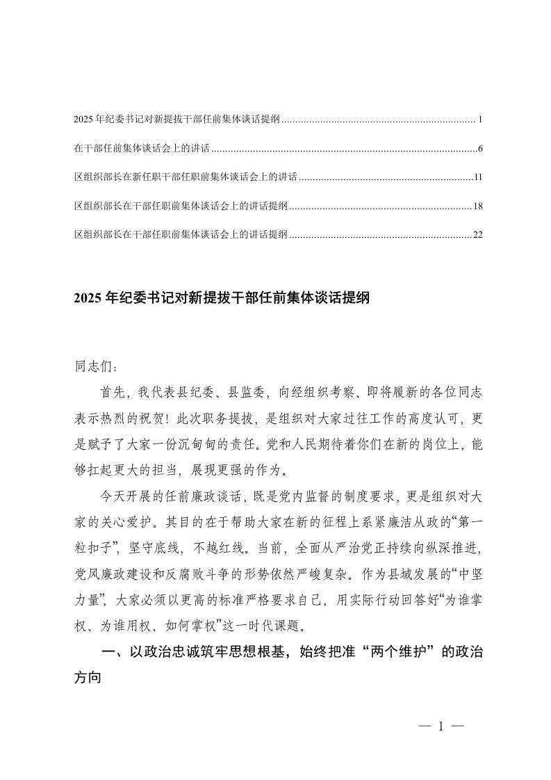 2025年纪委书记对新提拔干部任前集体谈话提纲