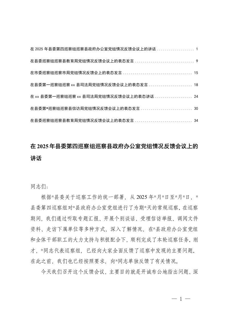 在2025年县委第四巡察组巡察县政府办公室党组情况反馈会议上的讲话讲话,巡察,政府,党组,巡察组,县委,办公室,