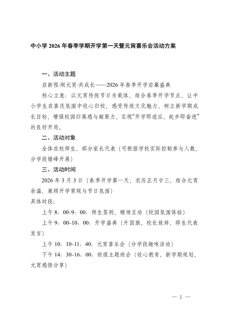 ,方案,中小学中小学2026年春季学期开学第一天暨元宵喜乐会