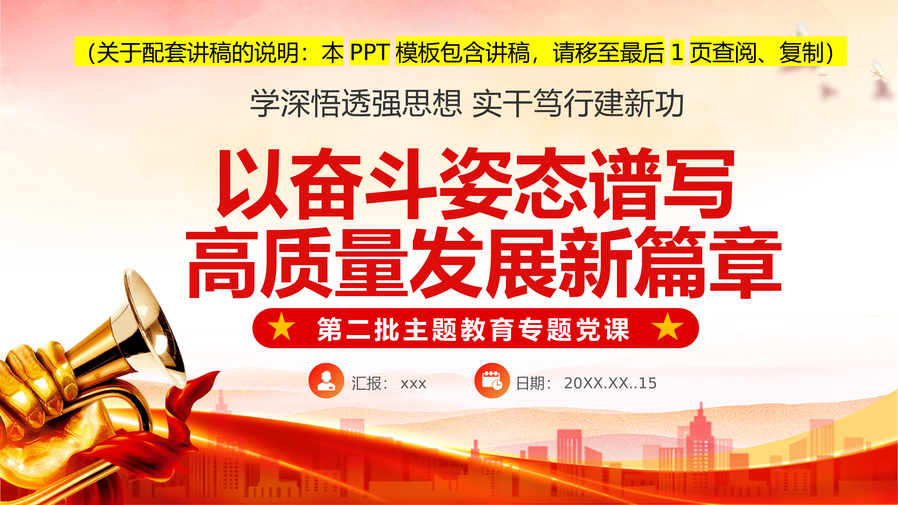 牢牢把握“12”字总要求修好主T教育这门必修课★学习贯彻时代中国特色社会主义思想主T教育★汇报:时间:学思想强党性重实践建新功前言/PREFACE在学习贯彻习近平时代中国特色社会主义思想主T教育工作会议上,习近平总书记鲜明指出“学思想、强党性、重实践、建新功”是这次主T教育的总要求,要求全党同志坚持学思用贯通、知信行统一,努力在以学铸魂、以学增智、以学正风、以学促干方面取得实实在在的成效。高标准高质量地开展好这次主T教育,我们必须牢牢把握这次主T教育的目标要求,精准聚焦、认真组织,确保主T教育不断深入、取得实效。目录CONTENTS要在“强党性”上求深入见实效02要在“重实践”上求深入见实效0...