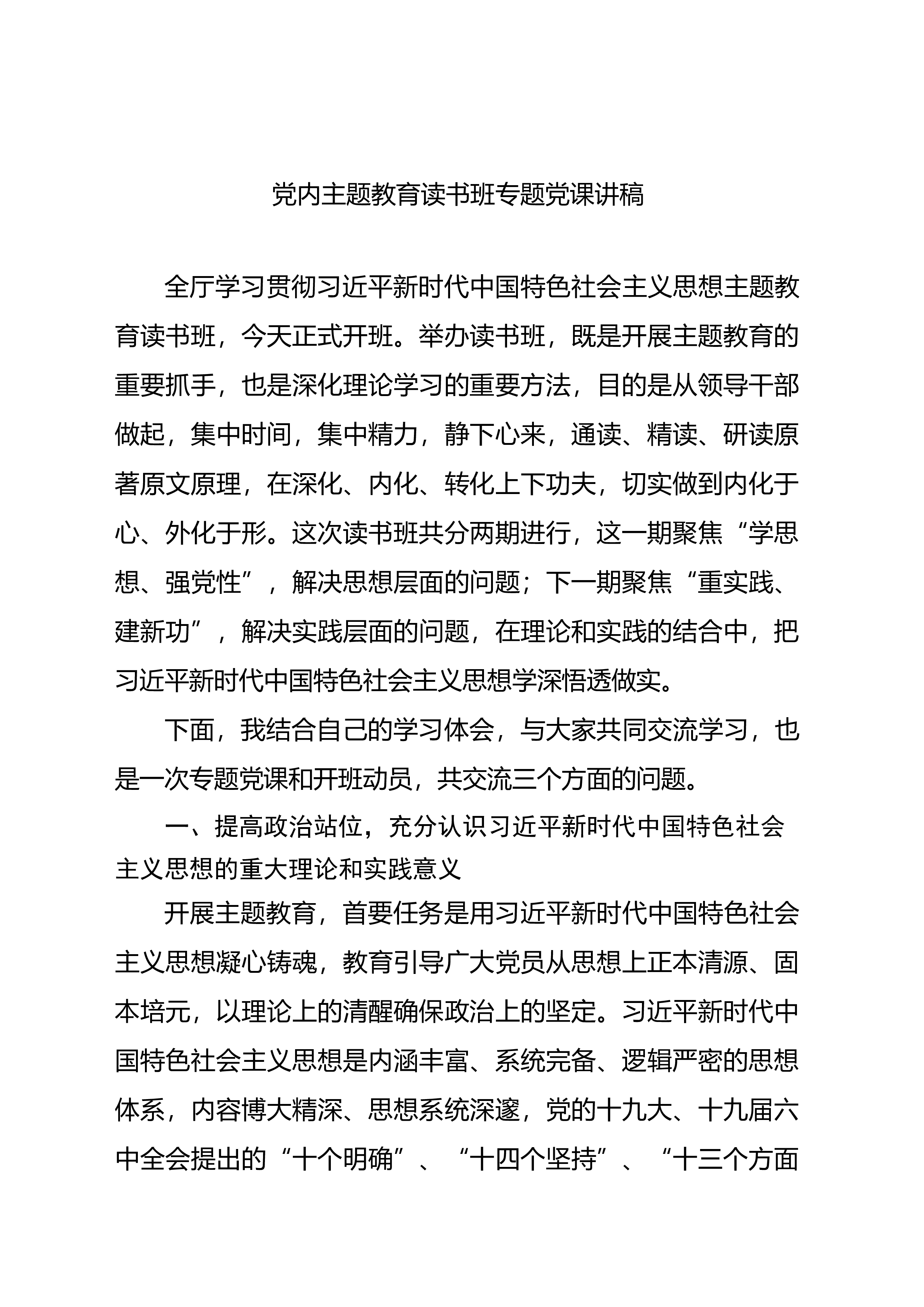 党内主T教育读书班专题党课讲稿全厅学习贯彻习近平新时代中国特色社会主义思想主T教育读书班,今天正式开班。举办读书班,既是开展主T教育的重要抓手,也是深化理论学习的重要方法,目的是从领导干部做起,集中时间,集中精力,静下心来,通读、精读、研读原著原文原理,在深化、内化、转化上下功夫,切实做到内化于心、外化于形。这次读书班共分两期进行,这一期聚焦“学思想、强党性”,解决思想层面的问题;下一期聚焦“重实践、建新功”,解决实践层面的问题,在理论和实践的结合中,把习近平新时代中国特色社会主义思想学深悟透做实。下面,我结合自己的学习体会,与大家共同交流学习,也是一次专题党课和开班动员,共交流三个方面的问题...