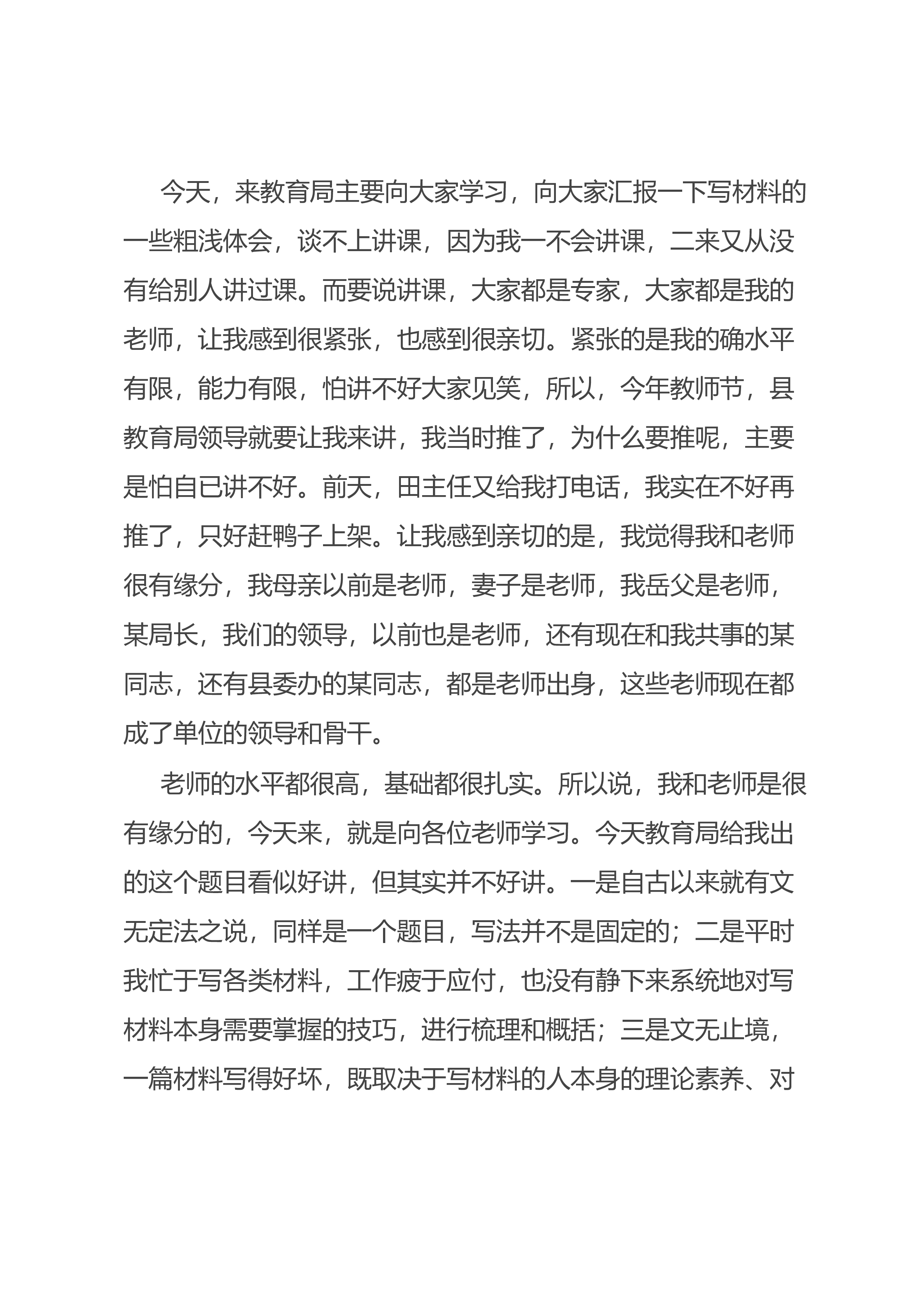今天,来教育局主要向大家学习,向大家汇报一下写材料的一些粗浅体会,谈不上讲课,因为我一不会讲课,二来又从没有给别人讲过课。而要说讲课,大家都是专家,大家都是我的老师,让我感到很紧张,也感到很亲切。紧张的是我的确水平有限,能力有限,怕讲不好大家见笑,所以,今年教师节,县教育局领导就要让我来讲,我当时推了,为什么要推呢,主要是怕自已讲不好。前天,田主任又给我打电话,我实在不好再推了,只好赶鸭子上架。让我感到亲切的是,我觉得我和老师很有缘分,我母亲以前是老师,妻子是老师,我岳父是老师,某局长,我们的领导,以前也是老师,还有现在和我共事的某同志,还有县委办的某同志,都是老师出身,这些老师现在都成了单位...