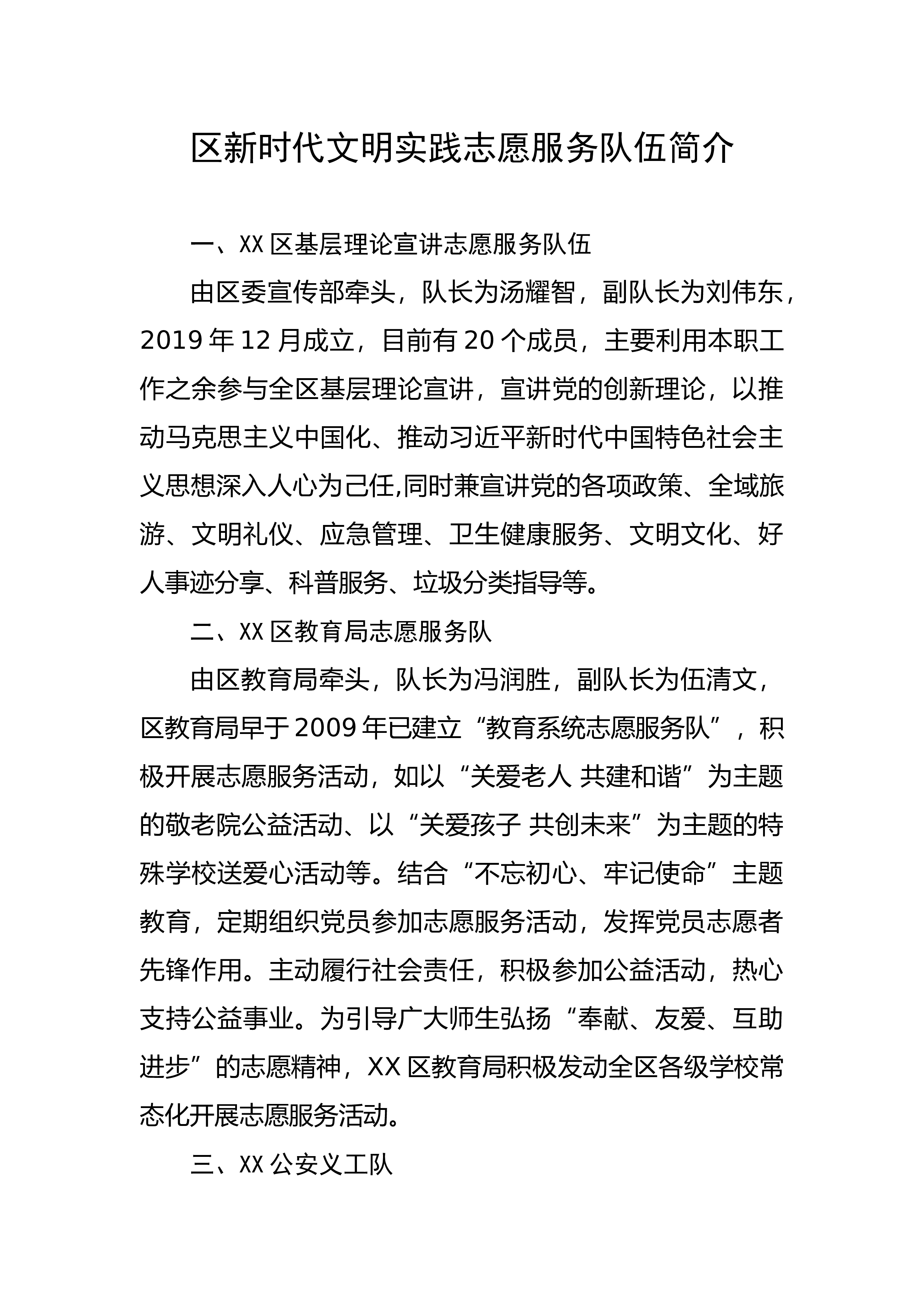 区新时代文明实践志愿服务队伍简介一、XX区基层理论宣讲志愿服务队伍由区委宣传部牵头,队长为汤耀智,副队长为刘伟东,2019年12月成立,目前有20个成员,主要利用本职工作之余参与全区基层理论宣讲,宣讲党的创新理论,以推动马克思主义中国化、推动习近平新时代中国特色社会主义思想深入人心为己任,同时兼宣讲党的各项政策、全域旅游、文明礼仪、应急管理、卫生健康服务、文明文化、好人事迹分享、科普服务、垃圾分类指导等。二、XX区教育局志愿服务队由区教育局牵头,队长为冯润胜,副队长为伍清文,区教育局早于2009年已建立“教育系统志愿服务队”,积极开展志愿服务活动,如以“关爱老人共建和谐”为主题的敬老院公益活动...