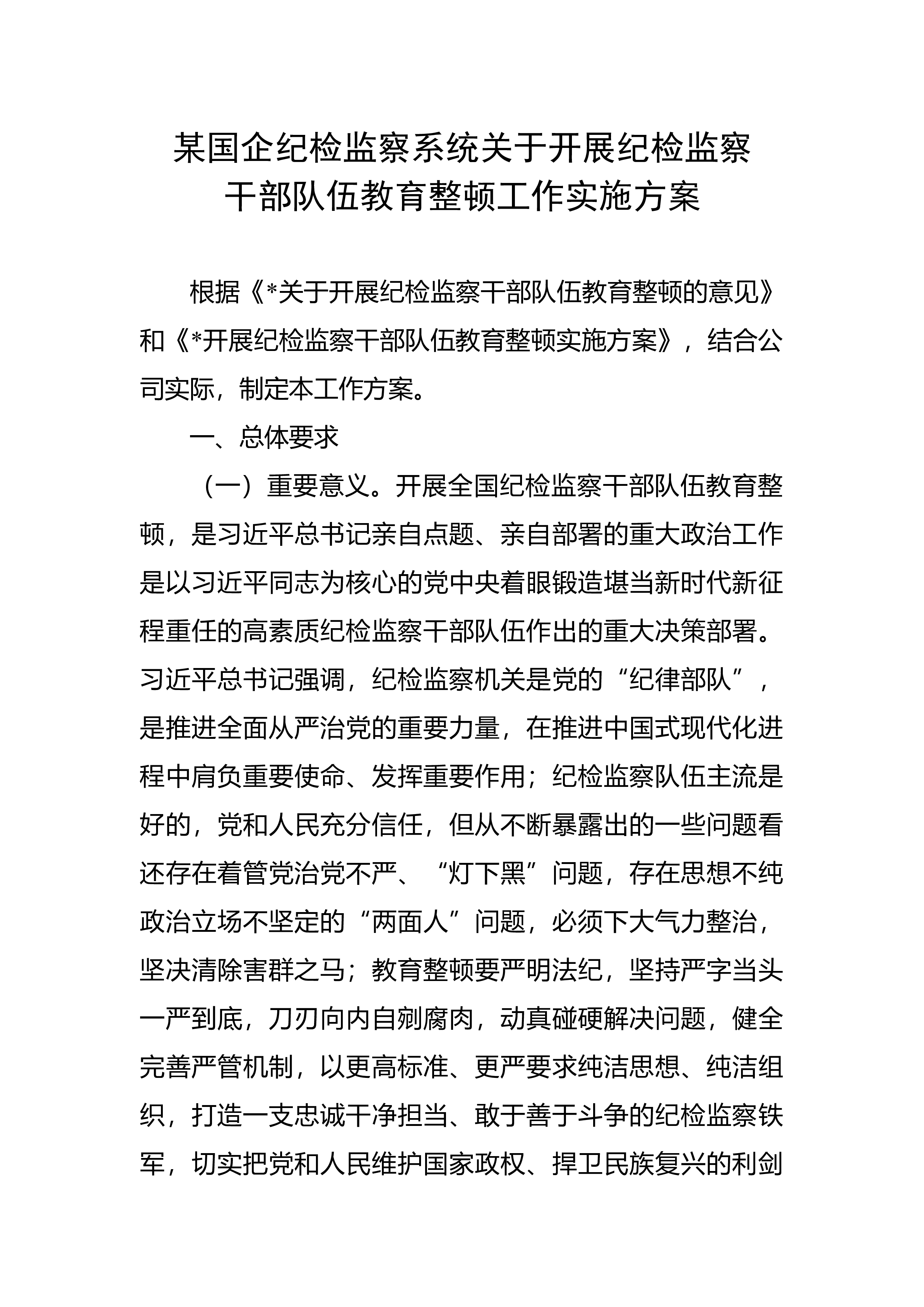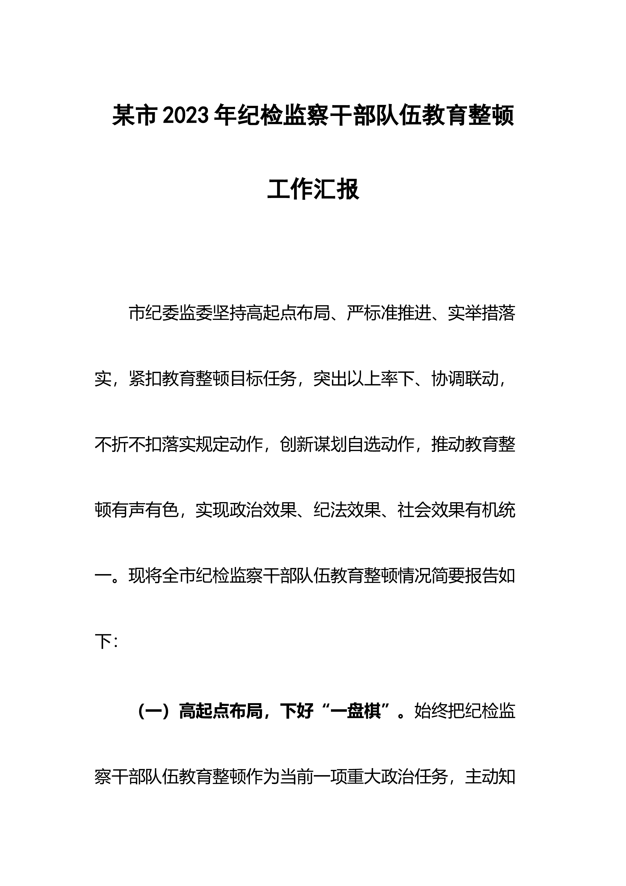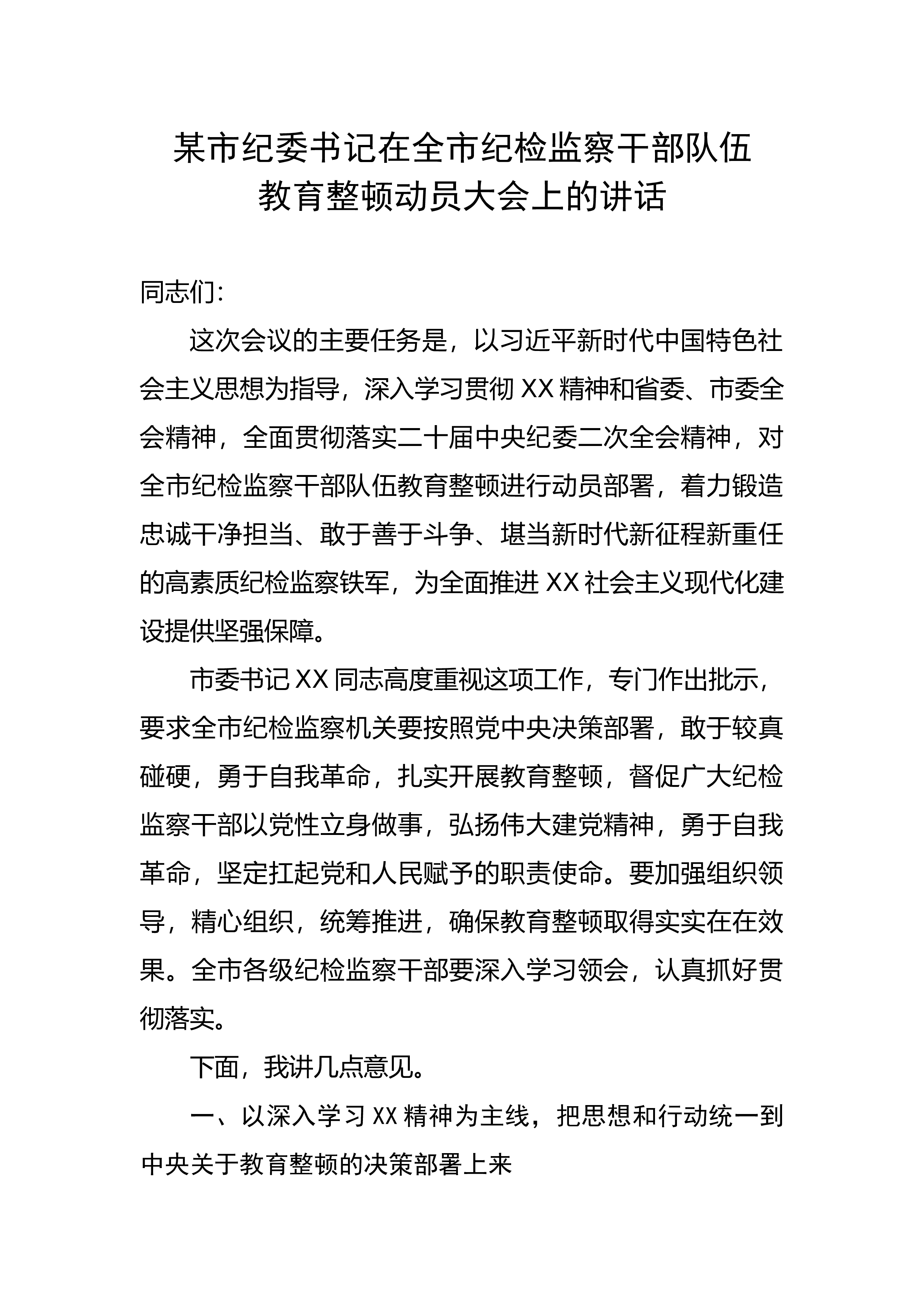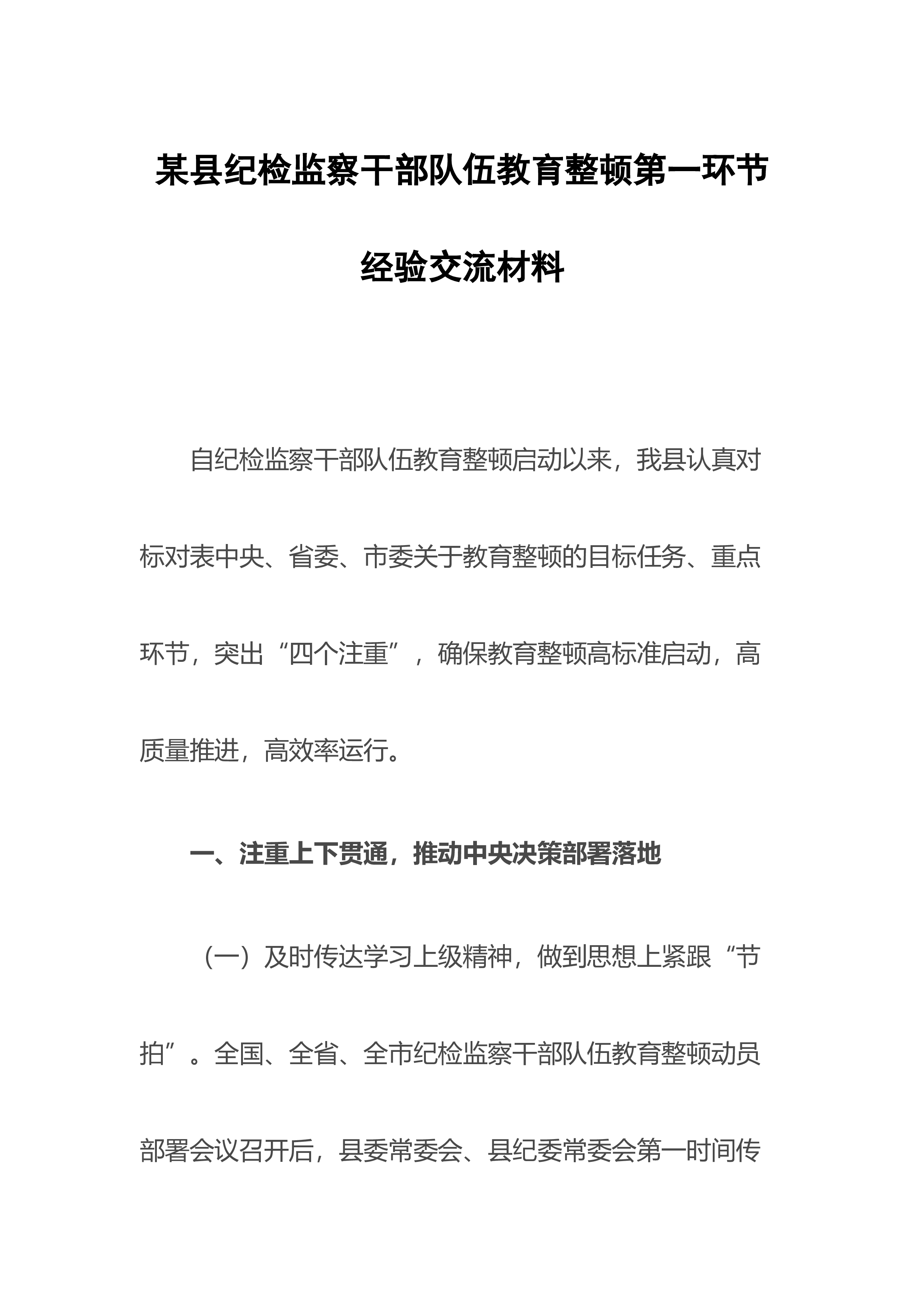 某县纪检监察干部队伍教育整顿第一环节经验交流材料自纪检监察干部队伍教育整顿启动以来,我县认真对标对表中央、省委、市委关于教育整顿的目标任务、重点环节,突出“四个注重”,确保教育整顿高标准启动,高质量推进,高效率运行。 一、注重上下贯通,推动中央决策部署落地 (一)及时传达学习上级精神,做到思想上紧跟“节拍”。全国、全省、全市纪检监察干部队伍教育整顿动员部署会议召开后,县委常委会、县纪委常委会第一时间传达学习习近平总书记重要讲话重要指示批示精神,中央、省委、市委关于纪检监察干部教育整顿的决策部署精神,深刻把握教育整顿的重大意义、目标任务、方法措施和重要要求,做到思想上坚决扛牢政治责任、知责于...
