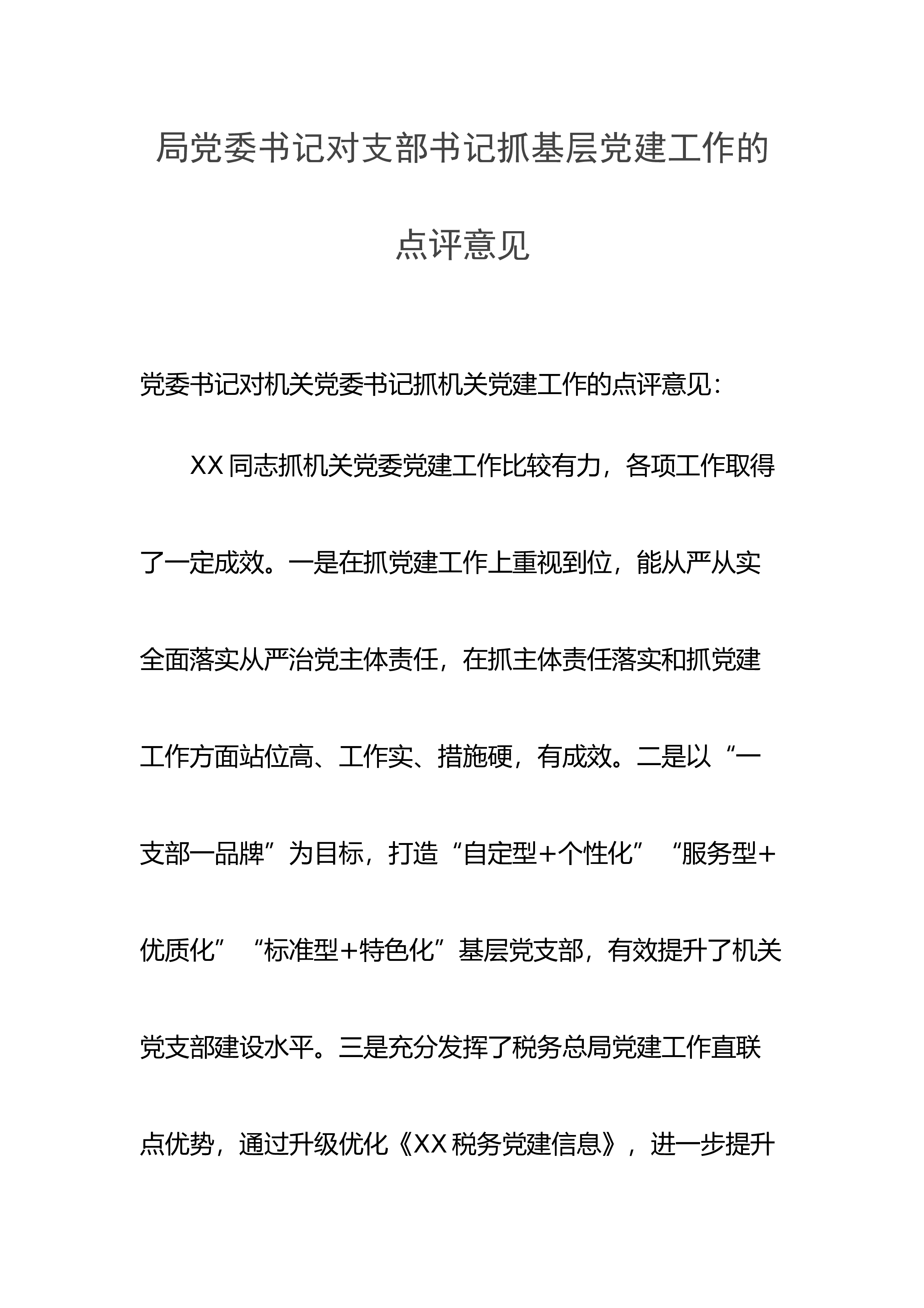 局党委书记对支部书记抓基层党建工作的点评意见党委书记对机关党委书记抓机关党建工作的点评意见: XX同志抓机关党委党建工作比较有力,各项工作取得了一定成效。一是在抓党建工作上重视到位,能从严从实全面落实从严治党主体责任,在抓主体责任落实和抓党建工作方面站位高、工作实、措施硬,有成效。二是以“一支部一品牌”为目标,打造“自定型+个性化”“服务型+优质化”“标准型+特色化”基层党支部,有效提升了机关党支部建设水平。三是充分发挥了税务总局党建工作直联点优势,通过升级优化《XX税务党建信息》,进一步提升党史学习教育的覆盖面、宣传度和影响力,营造了浓厚的党史学习氛围。 对今后的工作,提三点建议:一是严...