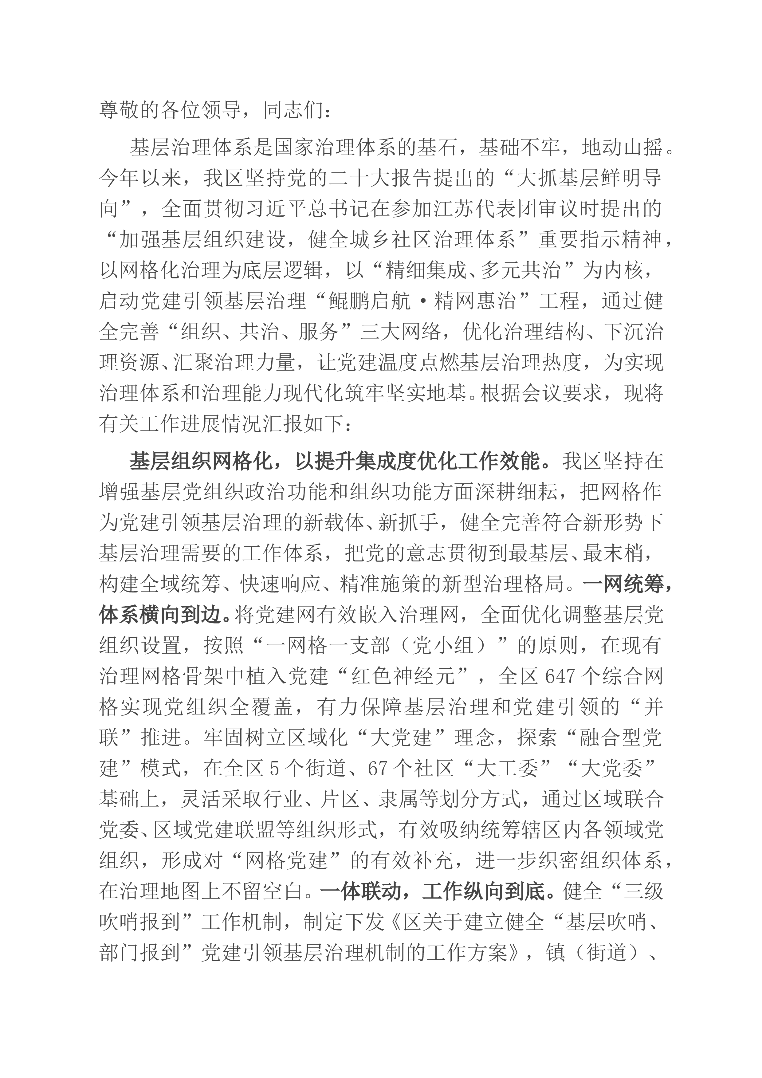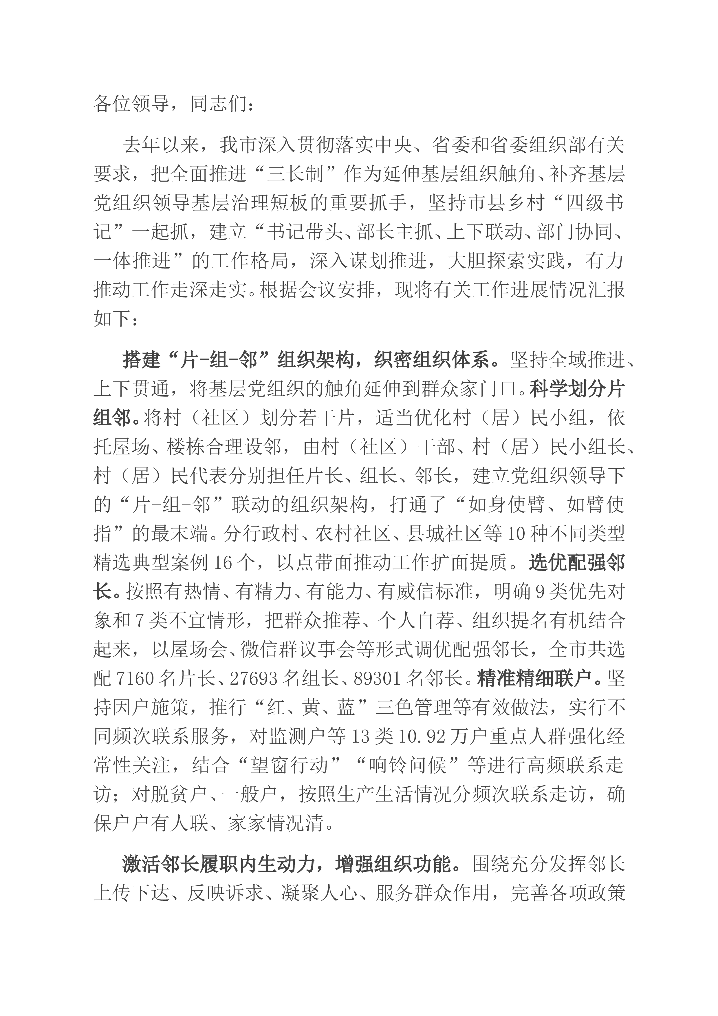 尊敬的**,各位领导,同志们:全国、全省组织工作会议系统阐述了习近平总书记关于党的建设的重要思想,分析了党的建设和组织工作面临的新形势、新任务,强调要围绕推动高质量发展、创新社会治理,增强基层党组织政治功能和组织功能。**市认真学习贯彻会议精神,深入推进落实“三长制”,将基层组织体系延伸到邻里间,把党的工作做到群众家门口,激活党建引领基层治理新动能。根据会议要求,现将有关工作进展情况汇报如下:构建贯通到底的“片—组—邻”体系,延伸组织链条。做好“三长制”工作,完善严密高效的组织体系是基础。要在村(社区)以下分级设置片长、组长、邻长,延伸工作触角,推动党的组织体系服务群众精细化、精准化。科学划片...