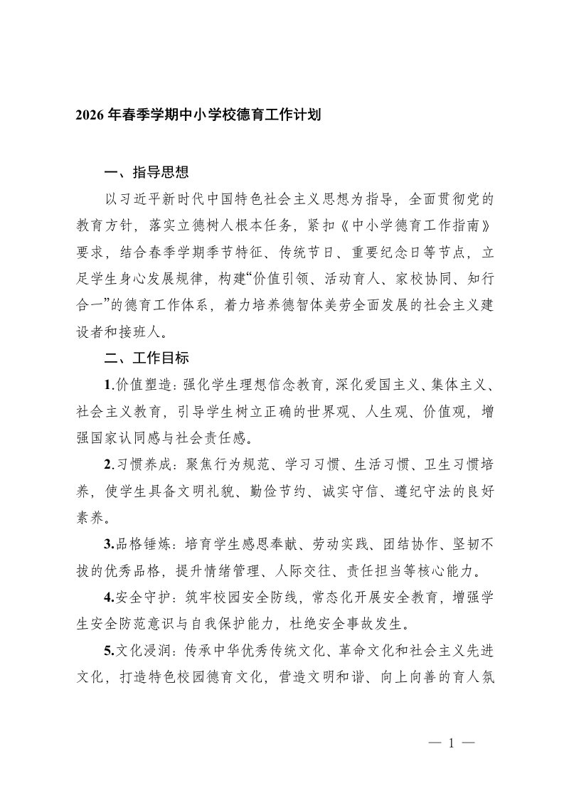 ,工作,学校,中小学,中小学校,学校德育2026年春季学期中小学校德育工作