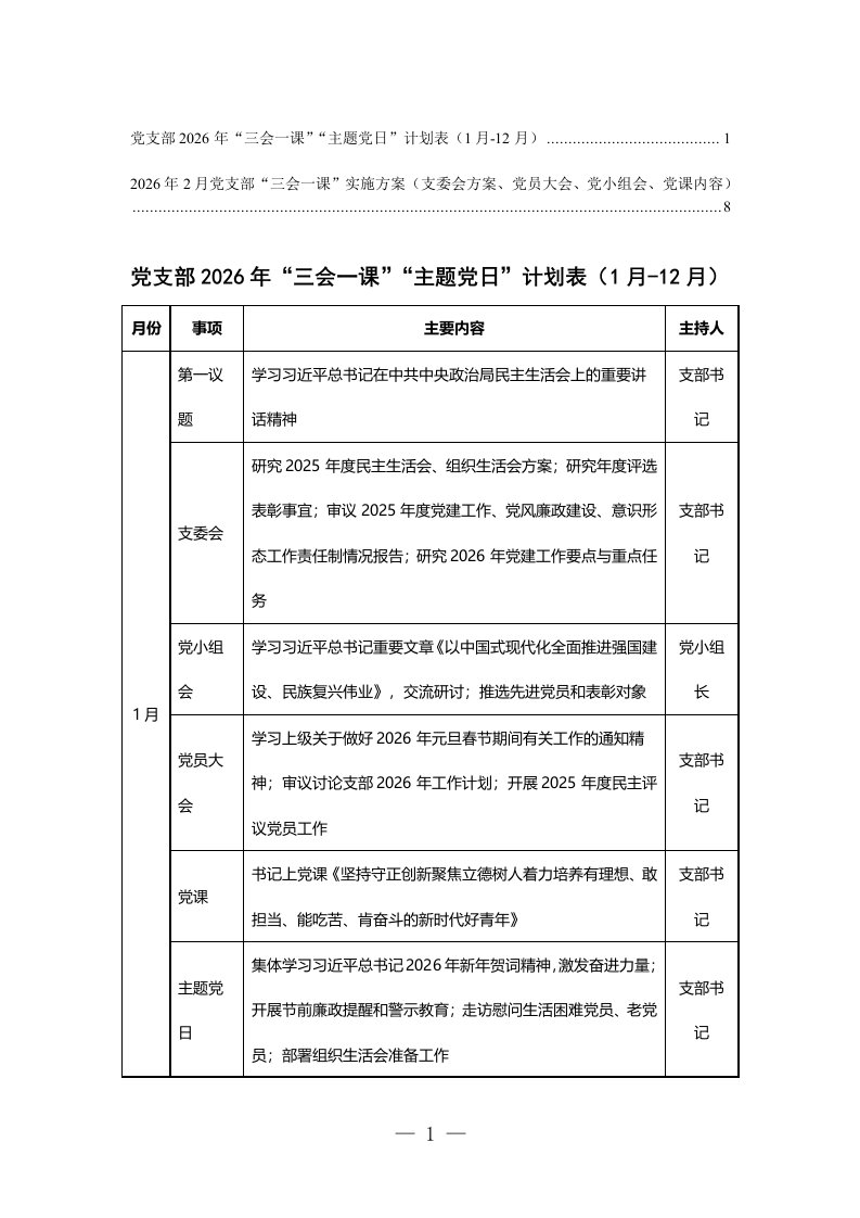 2026年度党支部常态化学习内容安排表党支部三会一课一月份会议记录党支部2026年党建工作