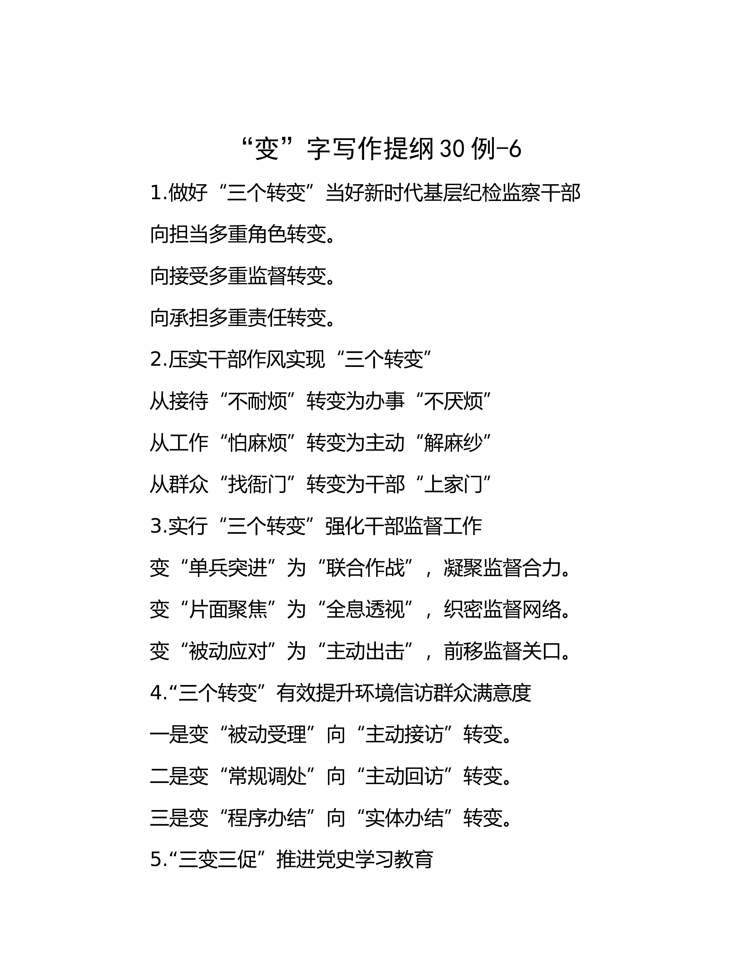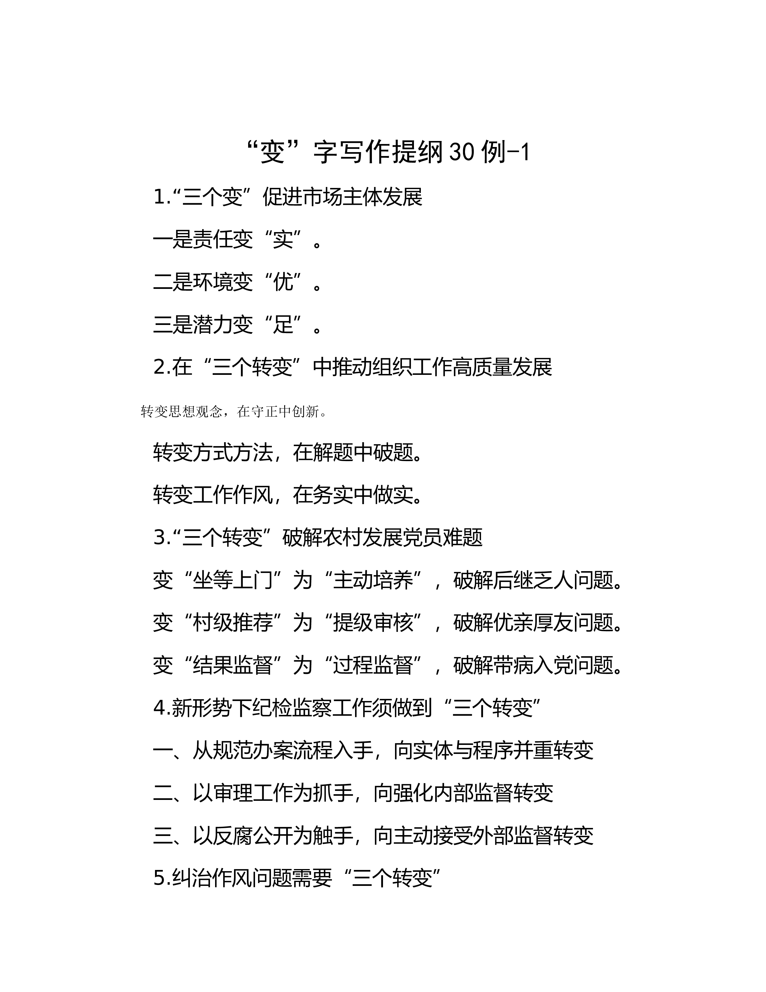 “变”字写作提纲30例-11.“三个变”促进市场主体发展一是责任变“实”。二是环境变“优”。三是潜力变“足”。2.在“三个转变”中推动组织工作高质量发展转变思想观念,在守正中创新。转变方式方法,在解题中破题。转变工作作风,在务实中做实。3.“三个转变”破解农村发展党员难题变“坐等上门”为“主动培养”,破解后继乏人问题。变“村级推荐”为“提级审核”,破解优亲厚友问题。变“结果监督”为“过程监督”,破解带病入党问题。4.新形势下