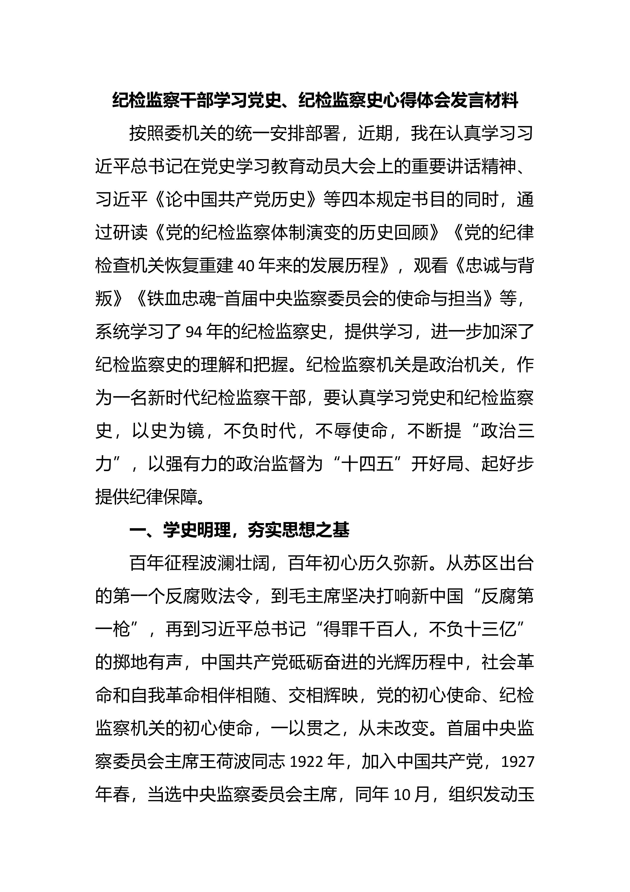 监察史心得体会发言材料按照委机关的统一安排部署,近期,我在认真学习习近平总书记在党史学习教育动员大会上的重要讲话精神、习近平《论中国共产党历史》等四本规定书目的同时,通过研读《党的