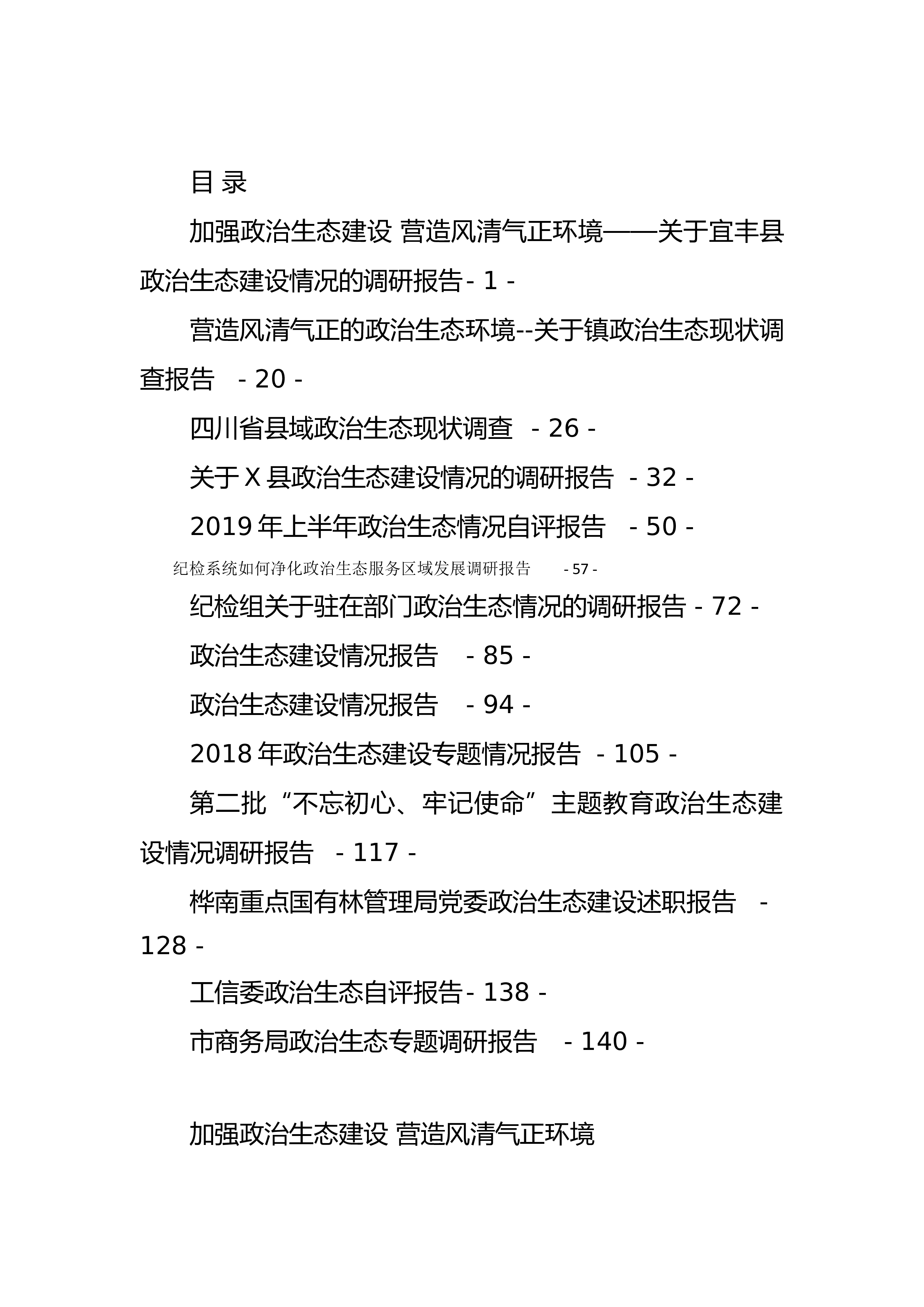 目录加强政治生态建设营造风清气正环境——关于宜丰县政治生态建设情况的调研报告-1-营造风清气正的政治生态环境--关于镇政治生态现状调查报告-20-四川省县域政治生态现状调查-26-关于X县政治生态建设情况的调研报告-32-2019年上半年政治生态情况自评报告-50-