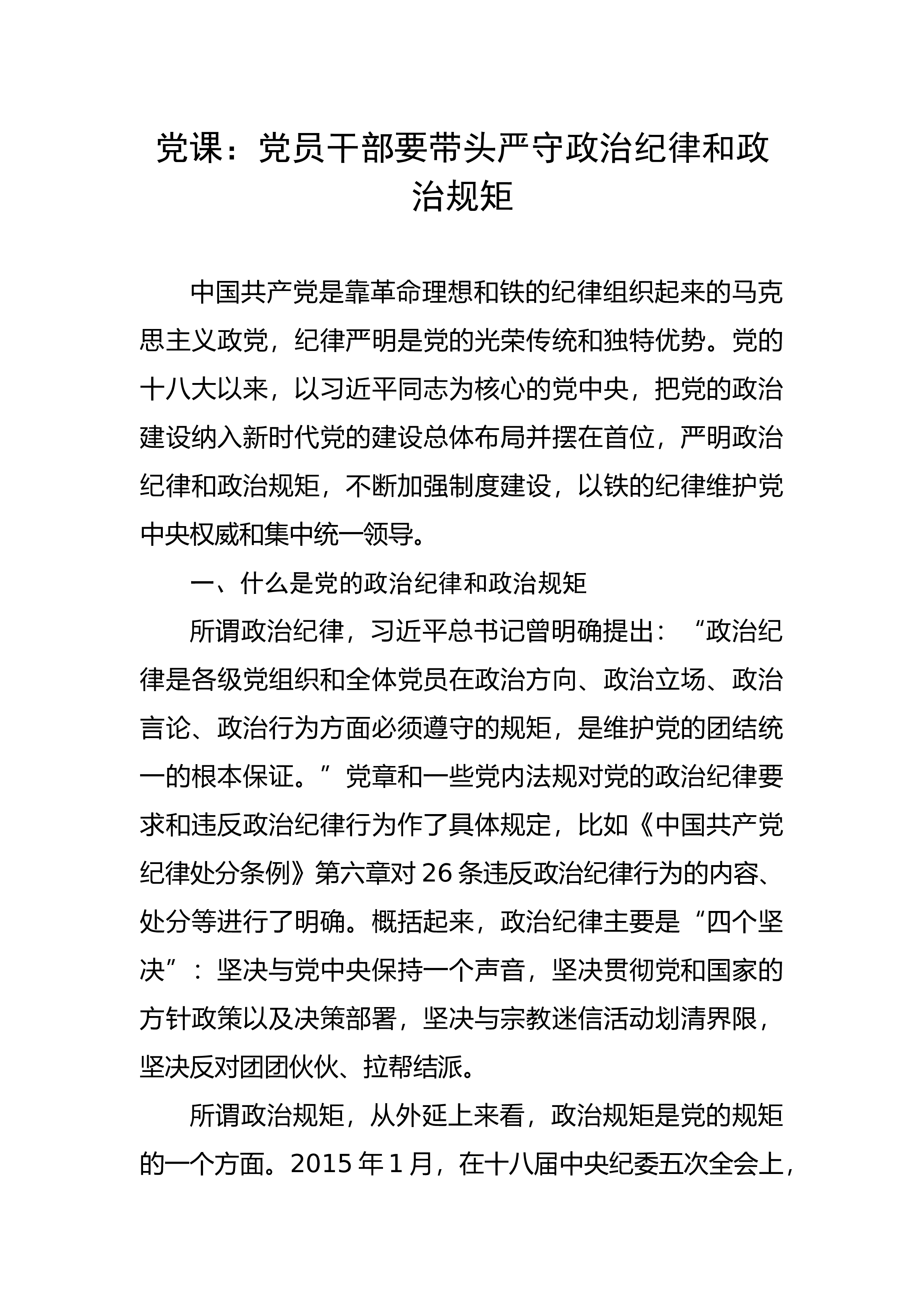 党课:党员干部要带头严守政治纪律和政治规矩中国共产党是靠革命理想和铁的纪律组织起来的马克思主义政党,纪律严明是党的光荣传统和独特优势。党的十八大以来,以习近平同志为核心的党中央,把党的政治建设纳入新时代党的建设总体布局并摆在首位,严明政治纪律和政治规矩,不断加强制度建设,以铁的纪律维护党中央权威和集中统一领导。一、什么是党的政治纪律和政治规矩所谓政治纪律,习近平总书记曾明确提出:“政治纪律是各级党组织和全体党员在政治方向、政治立场、政治言论、政治行为方面必须遵守的规矩,是维护党的团结统一的根本保证。”党章和一些党内法规对党的政治纪律要求和违反政治纪律行为作了具体规定,比如《中国共产党纪律处分条...