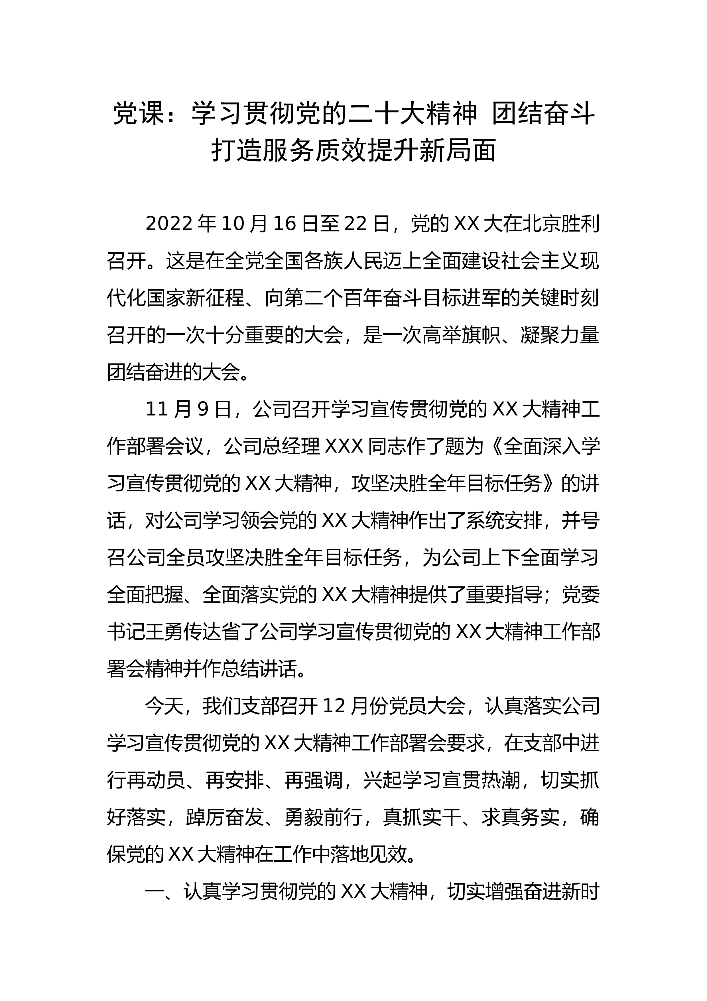 党课:学习贯彻党的二十大精神团结奋斗打造服务质效提升新局面2022年10月16日至22日,党的XX大在北京胜利召开。这是在全党全国各族人民迈上全面建设社会主义现代化国家新征程、向第二个百年奋斗目标进军的关键时刻召开的一次十分重要的大会,是一次高举旗帜、凝聚力量团结奋进的大会。11月9日,公司召开学习宣传贯彻党的XX大精神工作部署会议,公司总经理XXX同志作了题为《全面深入学习宣传贯彻党的XX大精神,攻坚决胜全年目标任务》的讲话,对公司学习领会党的XX大精神作出了系统安排,并号召公司全员攻坚决胜全年目标任务,为公司上下全面学习全面把握、全面落实党的XX大精神提供了重要指导;党委书记王勇传达省了公...