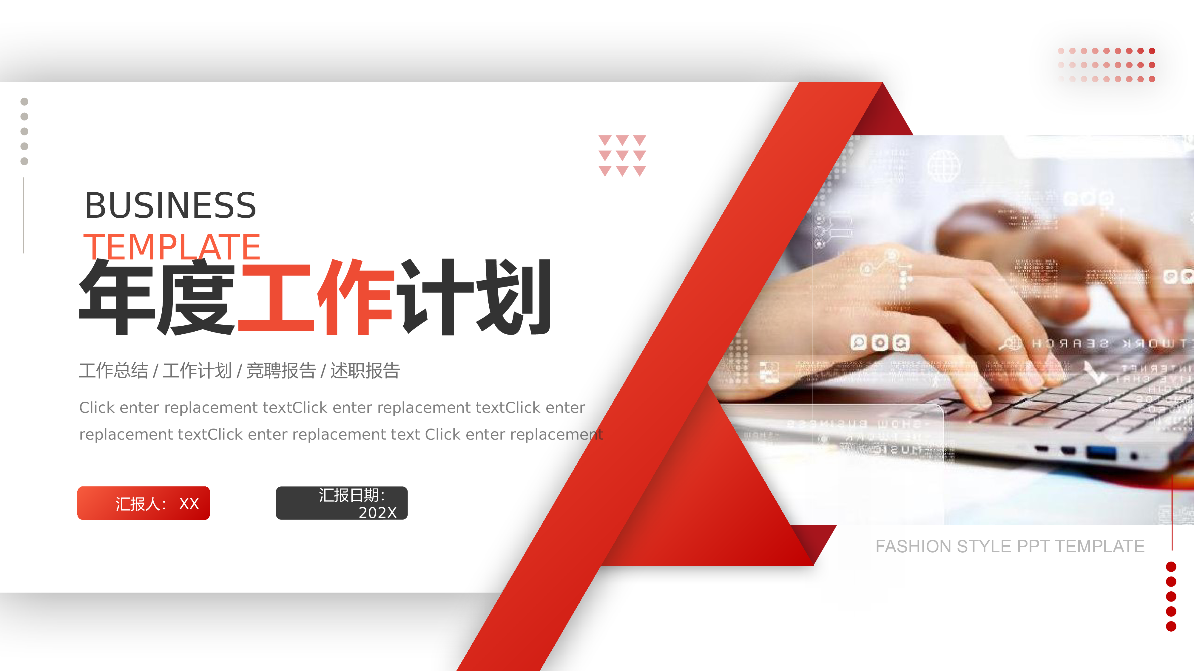 年度工作计划BUSINESSTEMPLATE汇报日期:202XClickenterreplacementtextClickenterreplacementtextClickenterreplacementtextClickenterreplacementtextClickenterreplacement工作总结/工作计划/