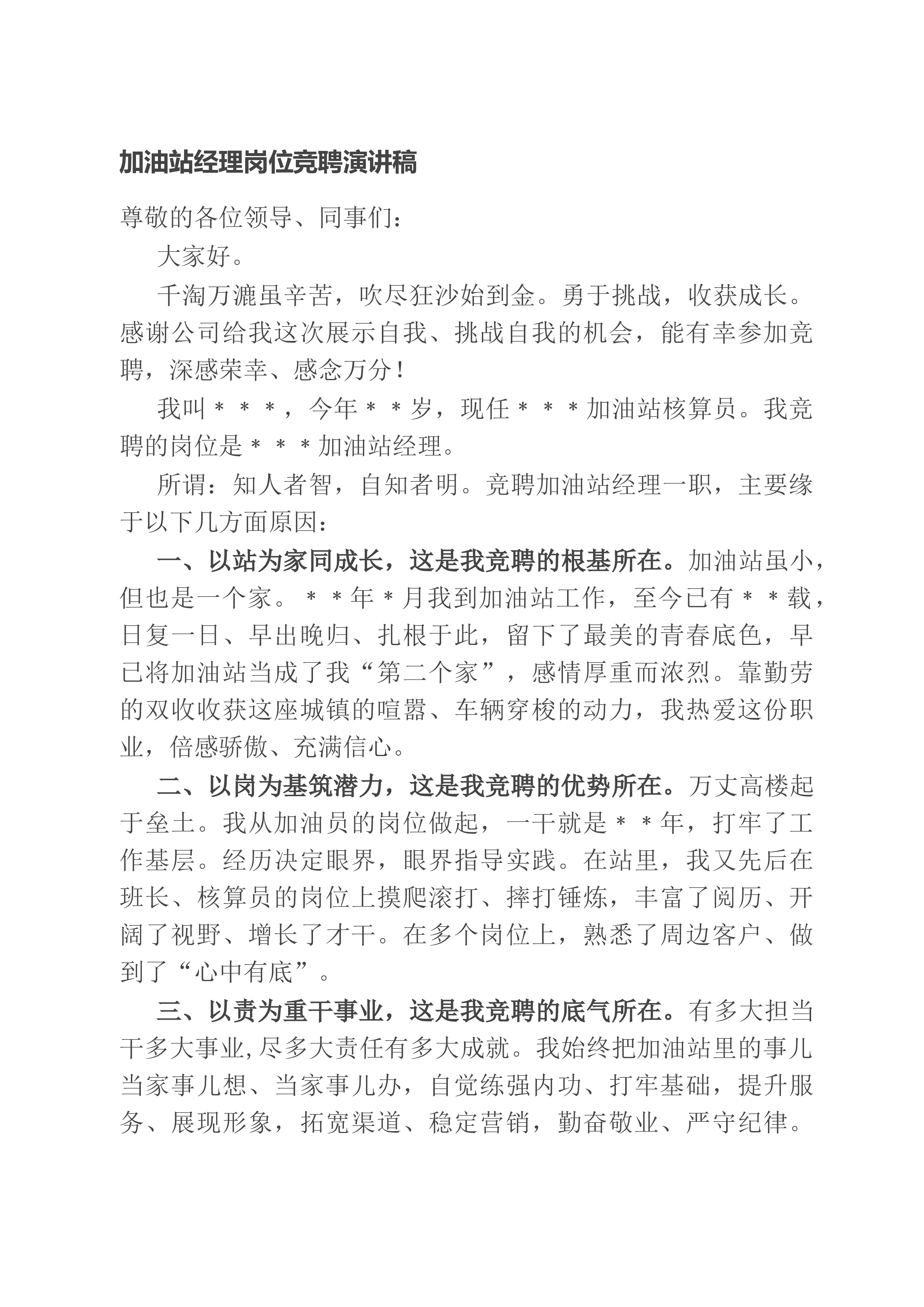 ,深感荣幸、感念万分!我叫﹡﹡﹡,今年﹡﹡岁,现任﹡﹡﹡加油站核算员。我
