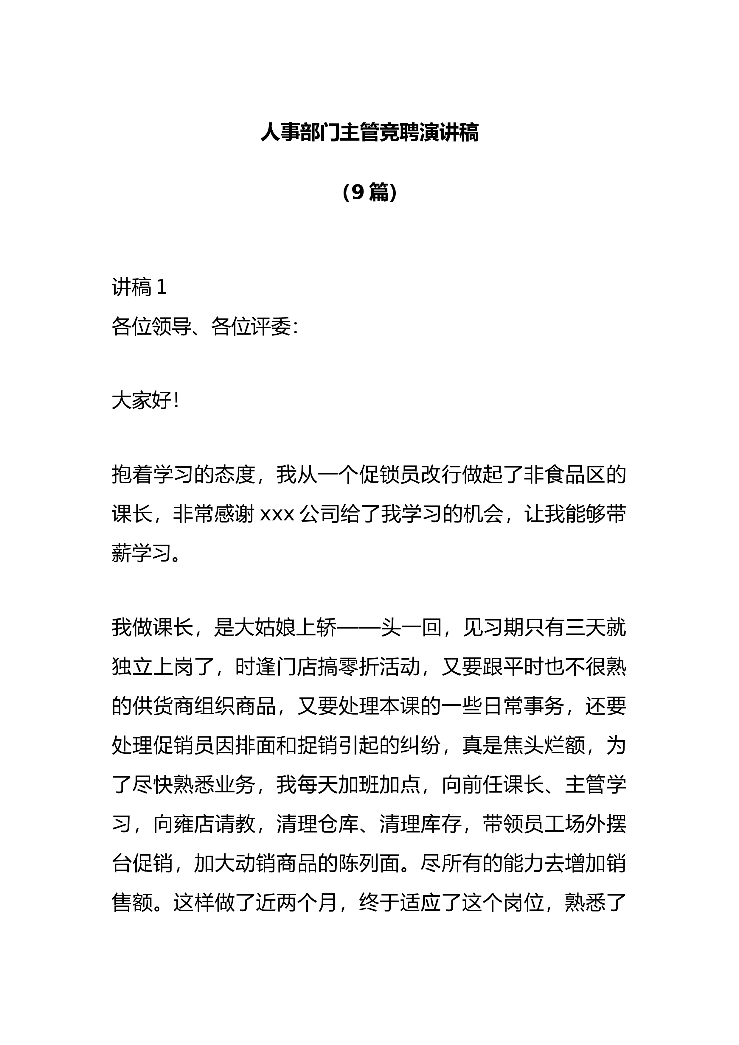 演讲稿(9篇)讲稿1各位领导、各位评委:大家好!抱着学习的态度,我从一个促锁员改行做起了非食品区的课长,非常感谢xxx公司给了我学习的机会,让我能够带薪学习。我做课长,是大姑娘上轿——头一回,见习期只有三天就独立上岗了,时逢门店搞零折活动,又要跟平时也不很熟的供货商组织商品,又要处理本课的一些日常事务,还要处理促销员因排面和捉销引起的纠纷,真是焦头烂额,为了尽快熟悉业务,我每天加班加点,向前任课长、主管学习,向雍店请教,清理仓库、清理库存,带领员工场外摆台促销,加大动销商品的陈列面。尽所有的能力去增加销售额。这样做了近两个月,终于适应了这个岗位,熟悉了...