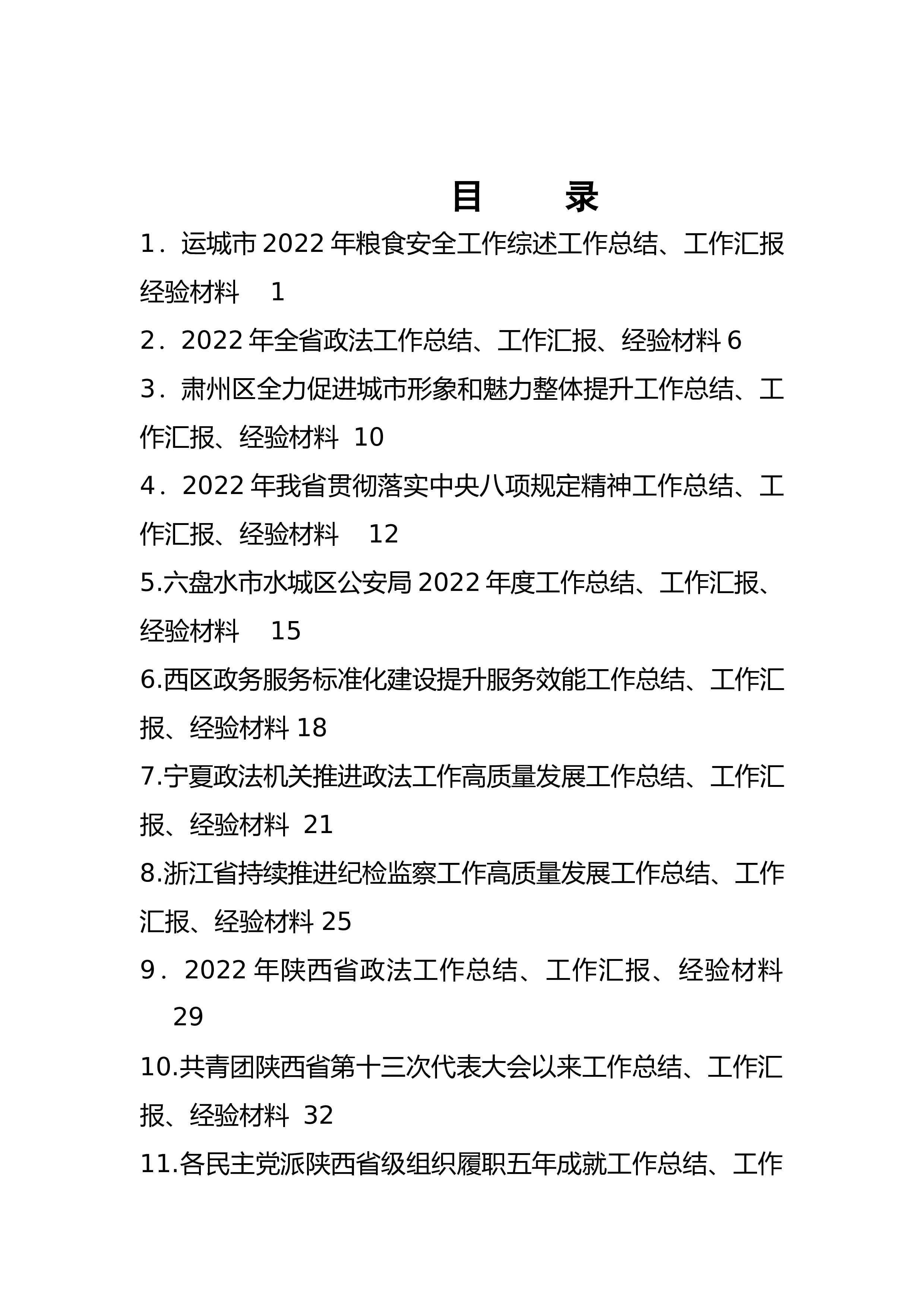 目录1.运城市2022年粮食安全工作综述工作总结、工作汇报经验材料12.2022年全省政法工作总结、工作汇报、经验材料63.肃州区全力促进城市形象和魅力整体提升工作总结、工作汇报、经验材料104.2022年我省贯彻落实中央八项规定精神工作总结、工作汇报、经验材料125.六盘水市水城区公安局2022年度工作总结、工作汇报、经验材料156.西区政务服务标准化建设提升服务效能工作总结、工作汇报、经验材料187.宁夏政法机关推进政法工作高质量发展工作总结、工作汇报、经验材料218.浙江省持续推进纪检监察工作高质量发展工作总结、工作汇报、经验材料259.2022年陕西省政法工作总结、工作汇报、经验材料2...