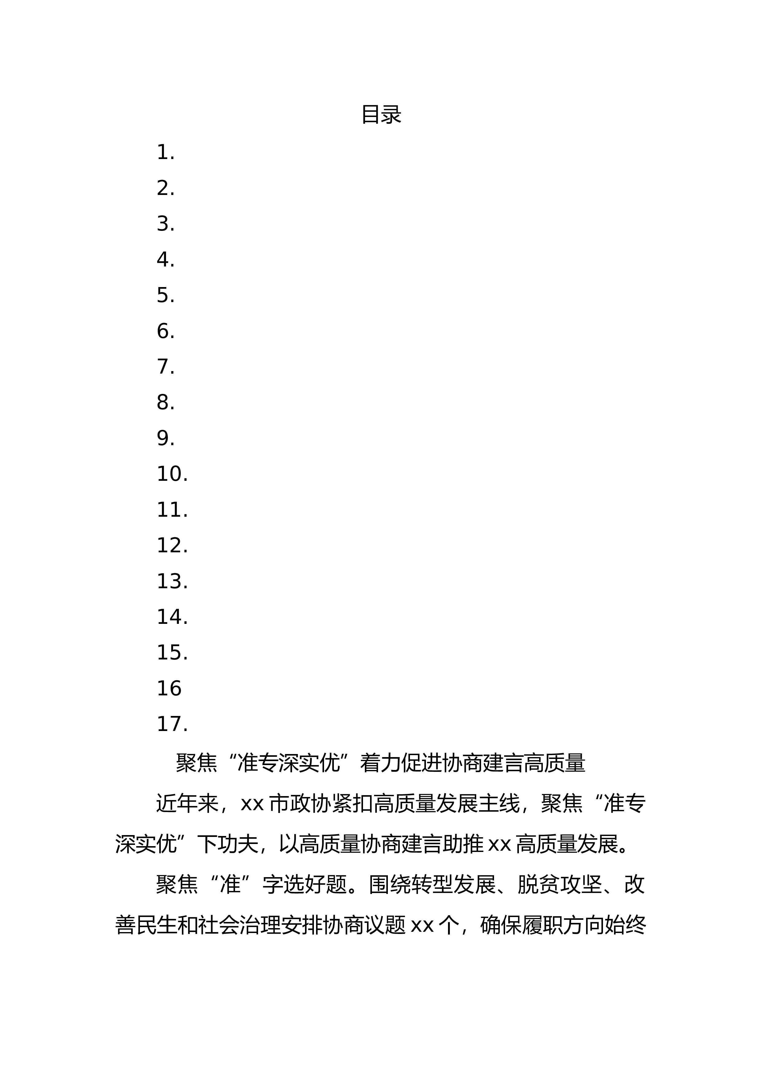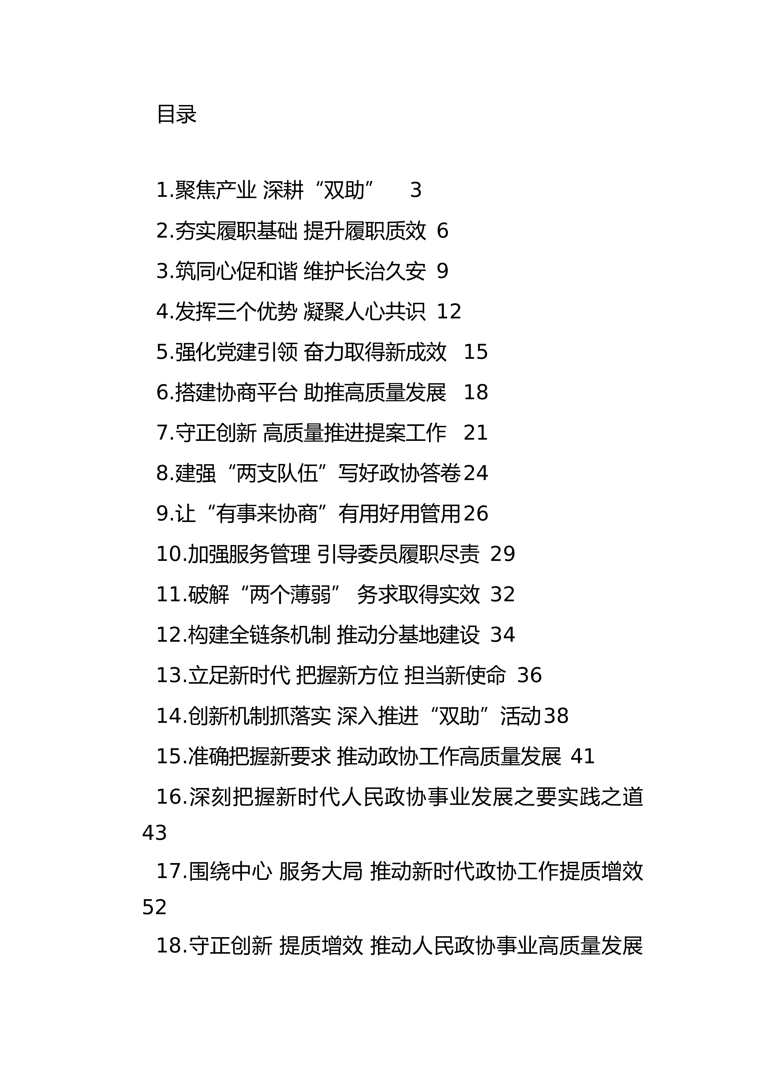目录1.聚焦产业深耕“双助”32.夯实履职基础提升履职质效63.筑同心促和谐维护长治久安94.发挥三个优势凝聚人心共识125.强化党建引领奋力取得新成效156.搭建协商平台助推高质量发展187.守正创新高质量推进提案工作218.建强“两支队伍”写好政协答卷249.让“有事来协商”有用好用管用2610.加强服务管理引导委员履职尽责2911.破解“两个薄弱”务求取得实效3212.构建全链条机制推动分基地建设3413.立足新时代把握新方位担当新使命3614.创新机制抓落实深入推进“双助”活动3815.准确把握新要求推动政协工作高质量发展4116.深刻把握新时代人民政协事业发展之要实践之道4317.围...