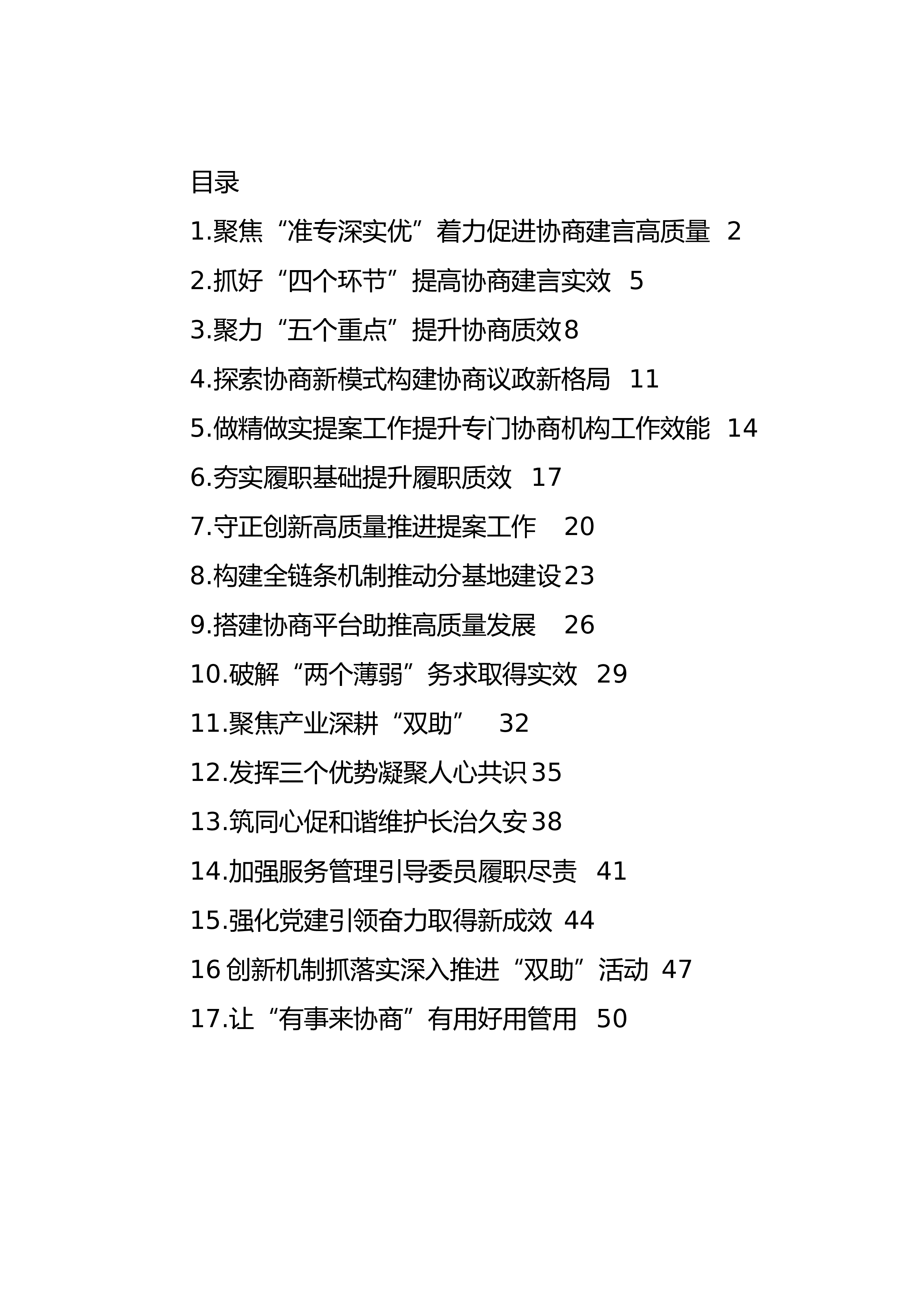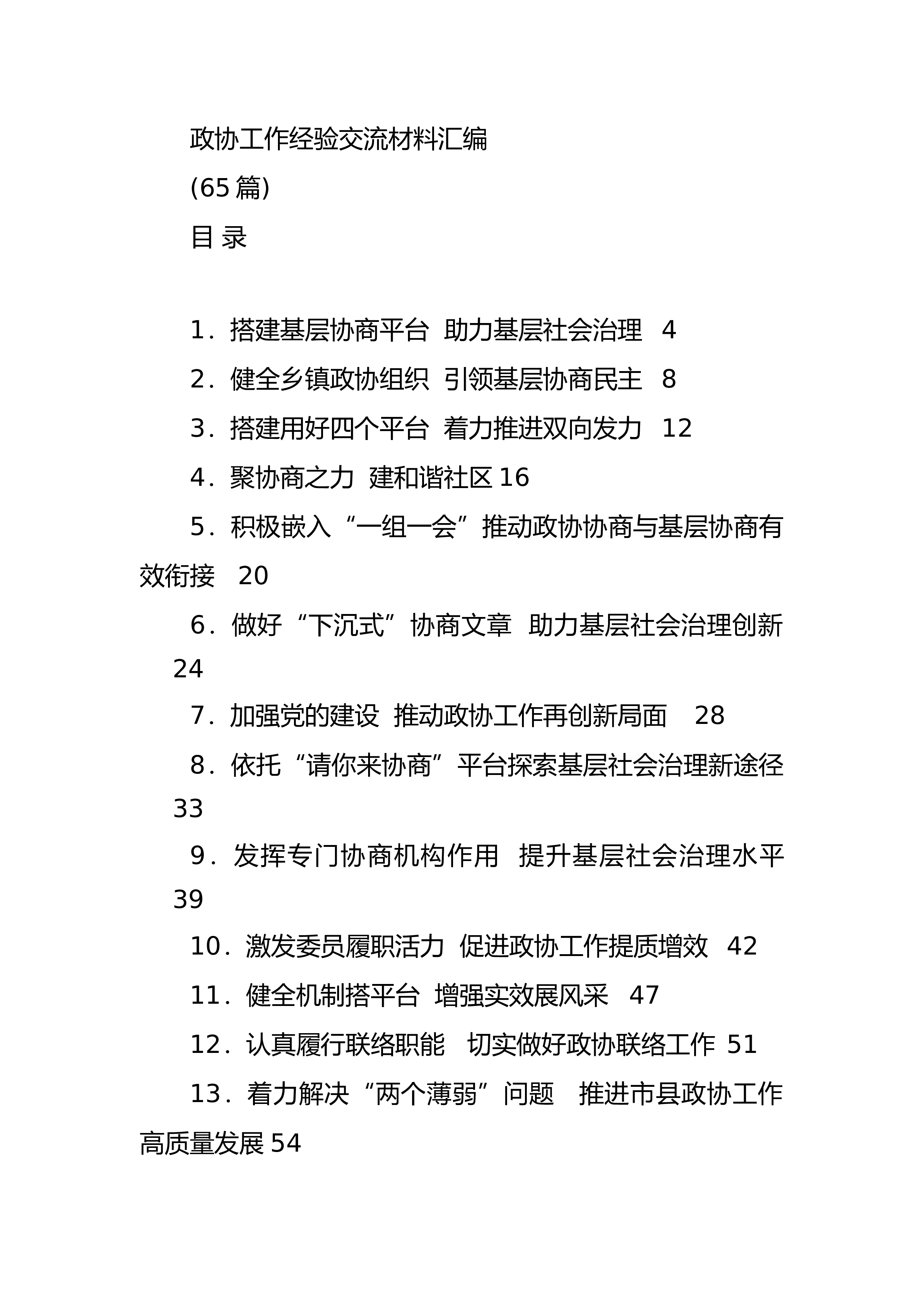 政协工作经验交流材料汇编(65篇)目录1.搭建基层协商平台助力基层社会治理42.健全乡镇政协组织引领基层协商民主83.搭建用好四个平台着力推进双向发力124.聚协商之力建和谐社区165.积极嵌入“一组一会”推动政协协商与基层协商有效衔接206.做好“下沉式”协商文章助力基层社会治理创新247.加强党的建设推动政协工作再创新局面288.依托“请你来协商”平台探索基层社会治理新途径339.发挥专门协商机构作用提升基层社会治理水平3910.激发委员履职活力促进政协工作提质增效4211.健全机制搭平台增强实效展风采4712.认真履行联络职能切实做好政协联络工作5113.着力解决“两个薄弱”问题推进市县...