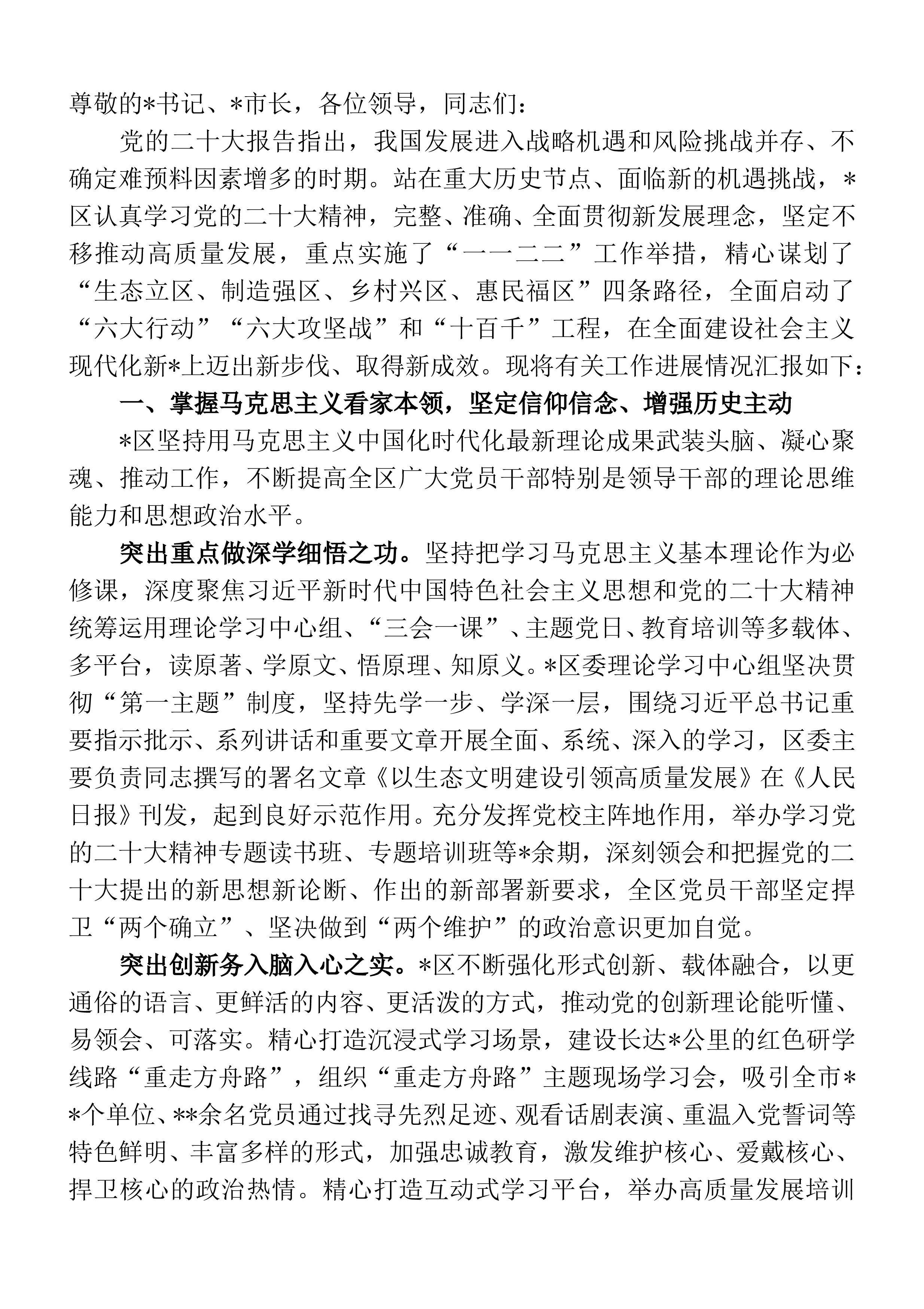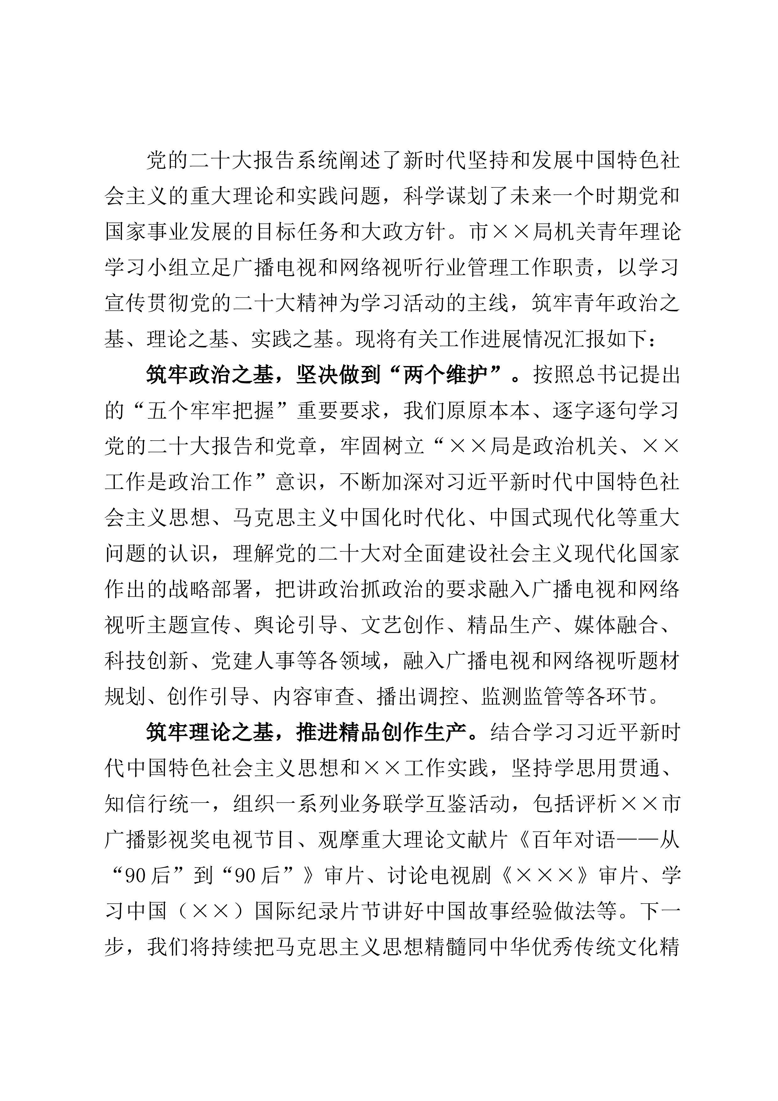 党的二十大报告系统阐述了新时代坚持和发展中国特色社会主义的重大理论和实践问题,科学谋划了未来一个时期党和国家事业发展的目标任务和大政方针。市××局机关青年理论学习小组立足广播电视和网络视听行业管理工作职责,以学习宣传贯彻党的二十大精神为学习活动的主线,筑牢青年政治之基、理论之基、实践之基。现将有关工作进展情况汇报如下:筑牢政治之基,坚决做到“两个维护”。按照总书记提出的“五个牢牢把握”重要要求,我们原原本本、逐字逐句学习党的二十大报告和党章,牢固树立“××局是政治机关、××工作是政治工作”意识,不断加深对习近平新时代中国特色社会主义思想、马克思主义中国化时代化、中国式现代化等重大问题的认识,理...