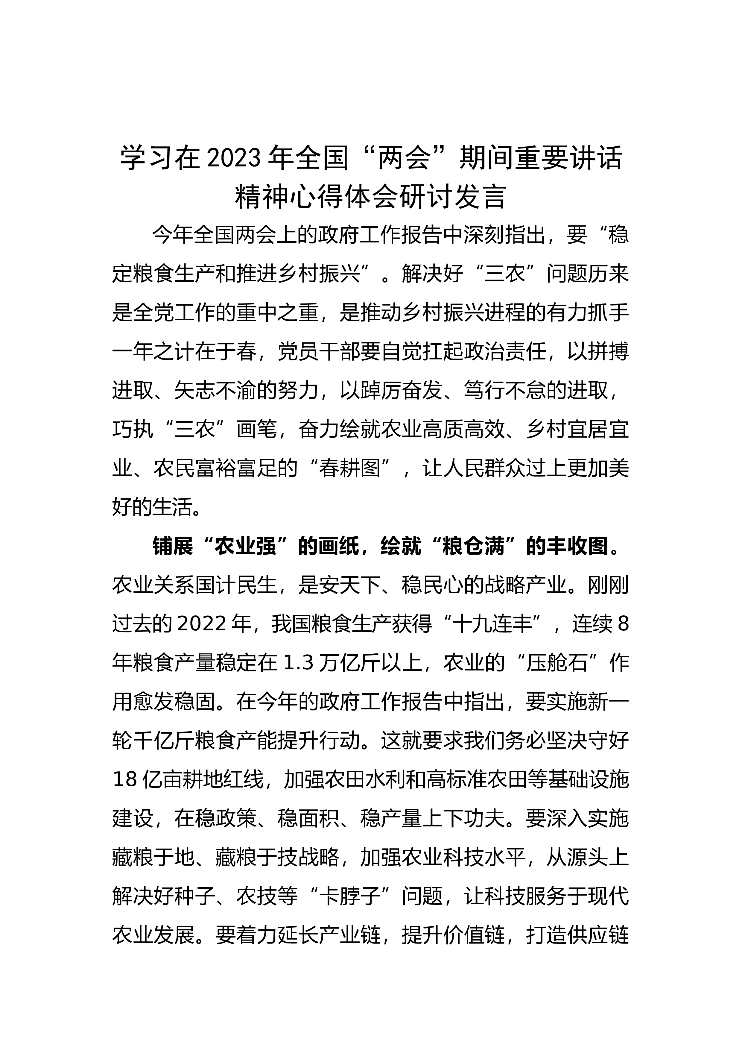 学习在2023年全国“两会”期间重要讲话精神心得体会研讨发言今年全国两会上的政府工作报告中深刻指出,要“稳定粮食生产和推进乡村振兴”。解决好“三农”问题历来是全党工作的重中之重,是推动乡村振兴进程的有力抓手一年之计在于春,党员干部要自觉扛起政治责任,以拼搏进取、矢志不渝的努力,以踔厉奋发、笃行不怠的进取,巧执“三农”画笔,奋力绘就农业高质高效、乡村宜居宜业、农民富裕富足的“春耕图”,让人民群众过上更加美好的生活。铺展“农业强”的画纸,绘就“粮仓满”的丰收图。农业关系国计民生,是安天下、稳民心的战略产业。刚刚过去的2022年,我国粮食生产获得“十九连丰”,连续8年粮食产量稳定在1.3万亿斤以上,...