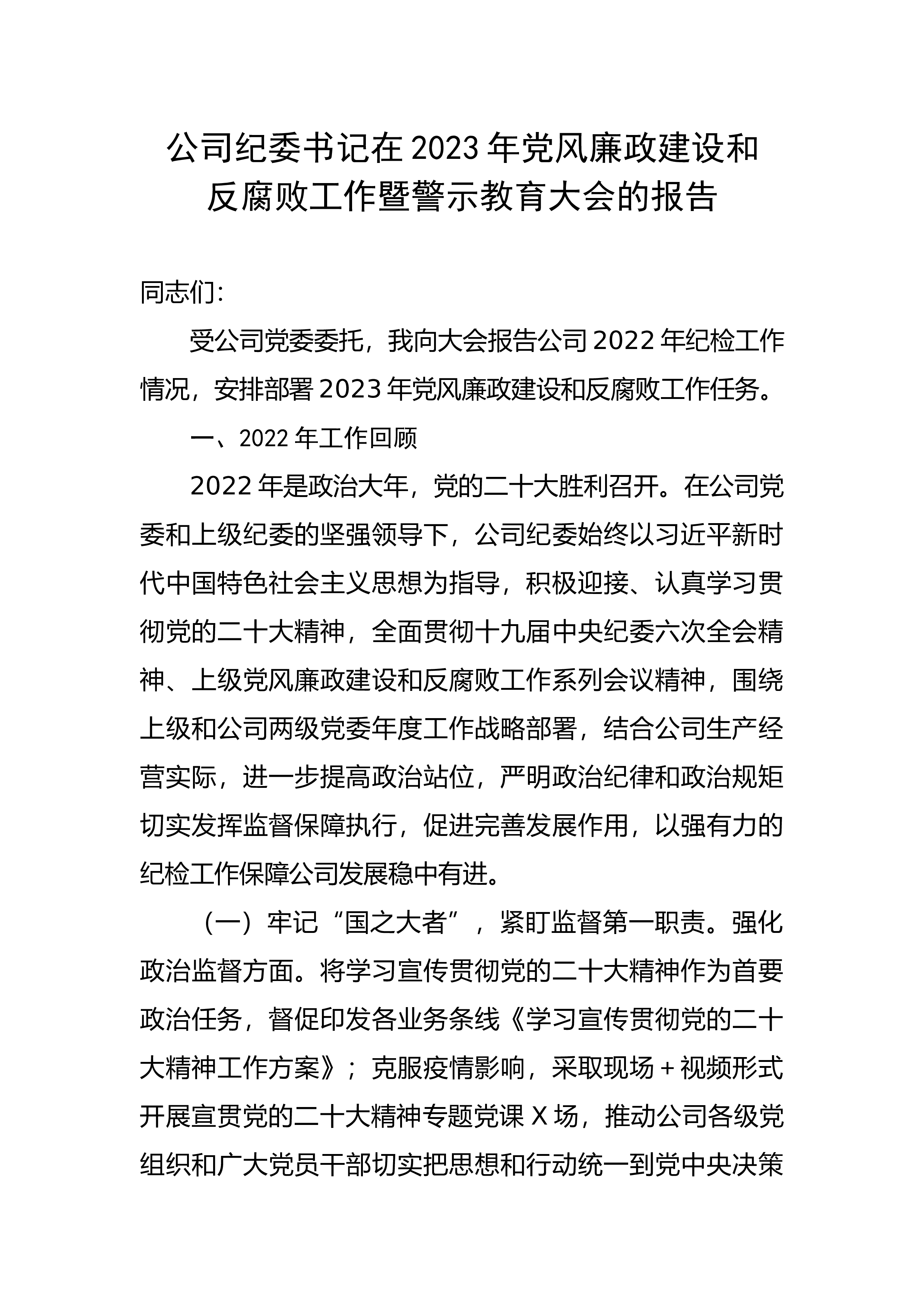 公司纪委书记在2023年党风廉政建设和反腐败工作暨警示教育大会的报告同志们:受公司党委委托,我向大会报告公司2022年纪检工作情况,安排部署2023年党风廉政建设和反腐败工作任务。一、2022年工作回顾2022年是政治大年,党的二十大胜利召开。在公司党委和上级纪委的坚强领导下,公司纪委始终以习近平新时代中国特色社会主义思想为指导,积极迎接、认真学习贯彻党的二十大精神,全面贯彻十九届中央纪委六次全会精神、上级党风廉政建设和反腐败工作系列会议精神,围绕上级和公司两级党委年度工作战略部署,结合公司生产经营实际,进一步提高政治站位,严明政治纪律和政治规矩切实发挥监督保障执行,促进完善发展作用,以强有力...